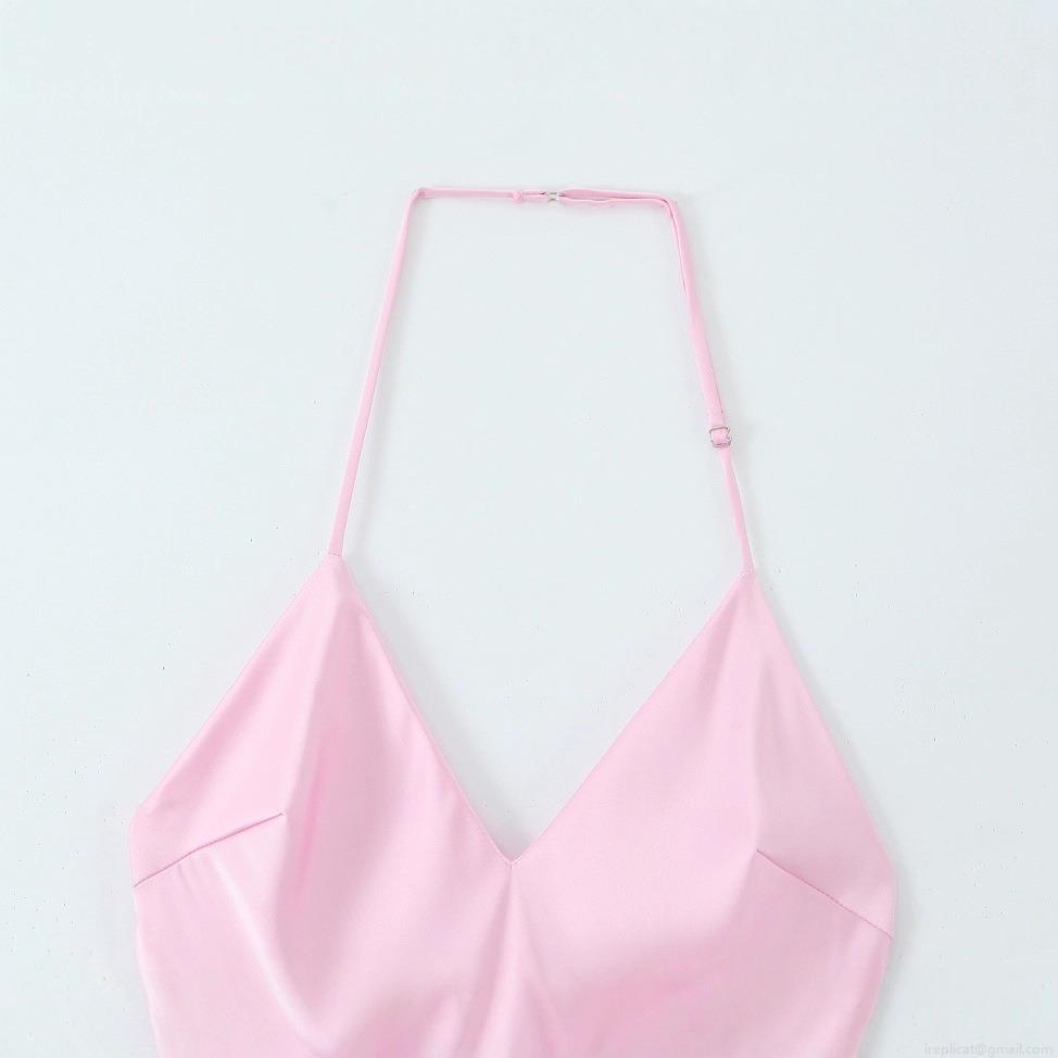 • Women's Sexy Backless Halter Satin Midi Dress Crisscross Neck Sleeveless Solid Pink Silk Texture Summer Elegant Party Dress
