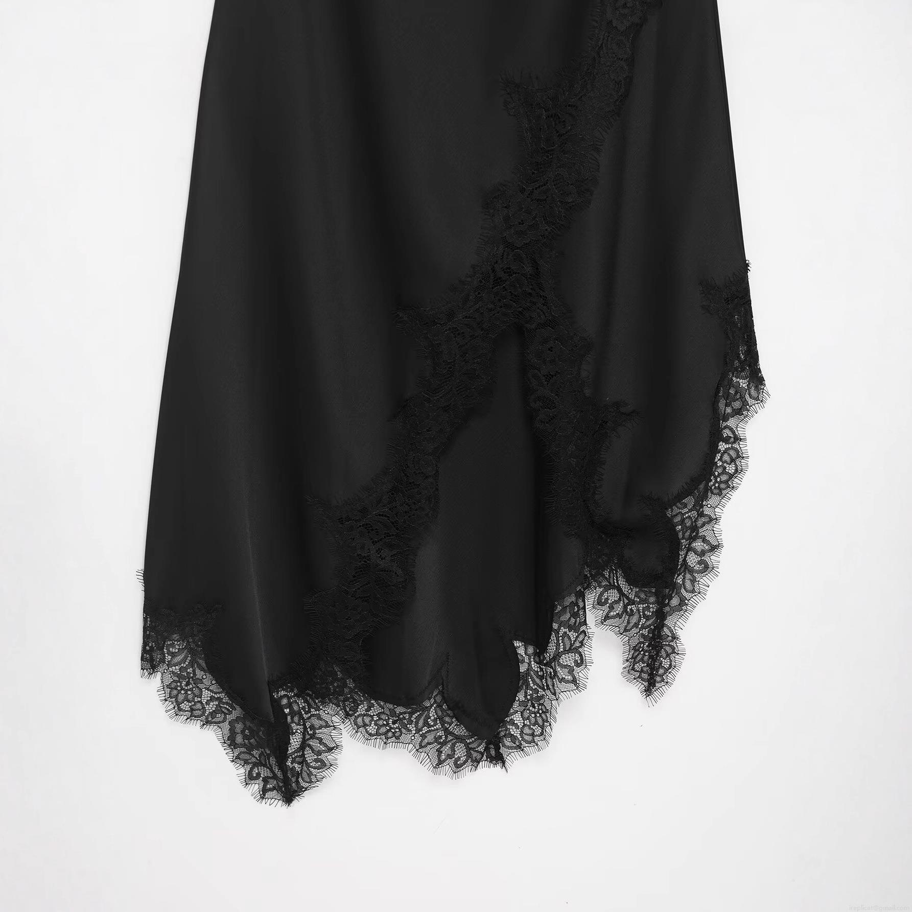 • Women's Sexy Black Satin Lace Patchwork Slip Dress Cowl Neck Spaghetti Strap Backless Slim Fit Midi Dress For Party Club Night Out