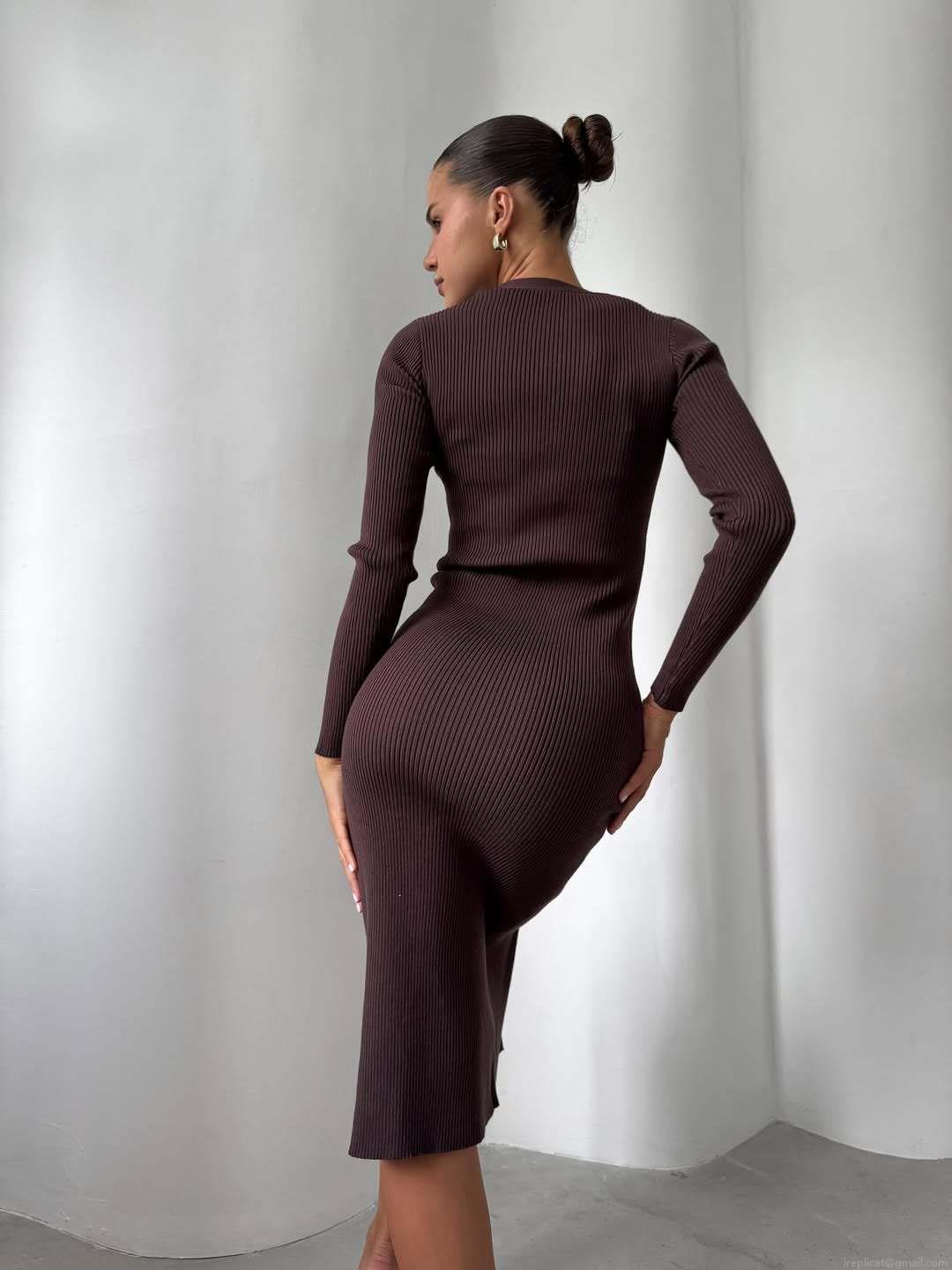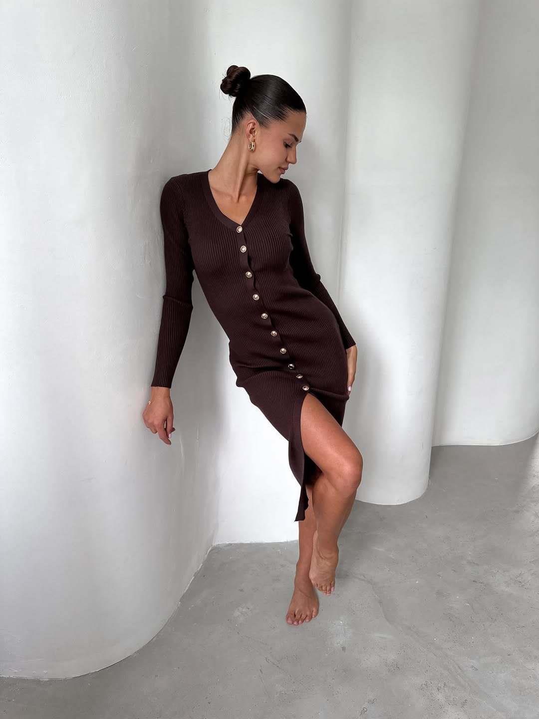 • Women's Sexy Brown Knit Midi Dress V-Neck Long Sleeve Slim Fit Side Split Bodycon Dress With Single-Breasted Buttons Ribbed Cotton Blend Sweater Dress For Party Dating
