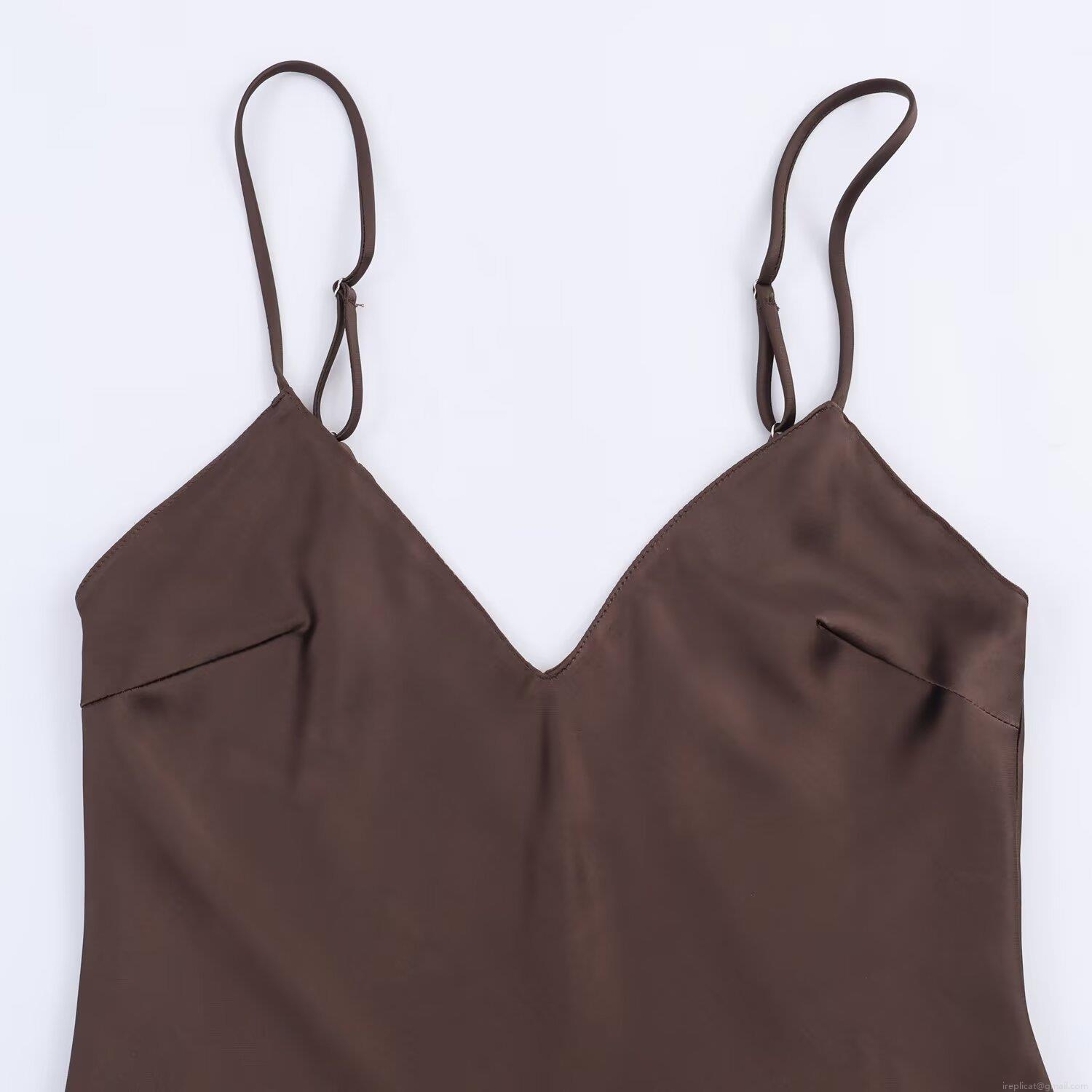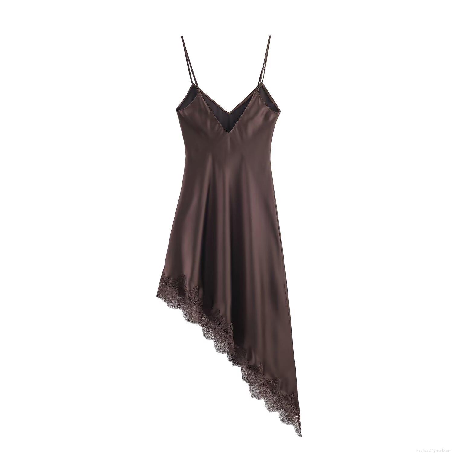 Women's Sexy Deep Brown Satin Slip Midi Dress With Lace Trim V-Neck Asymmetric Hem Autumn Sleeveless Evening Party Dress For Women