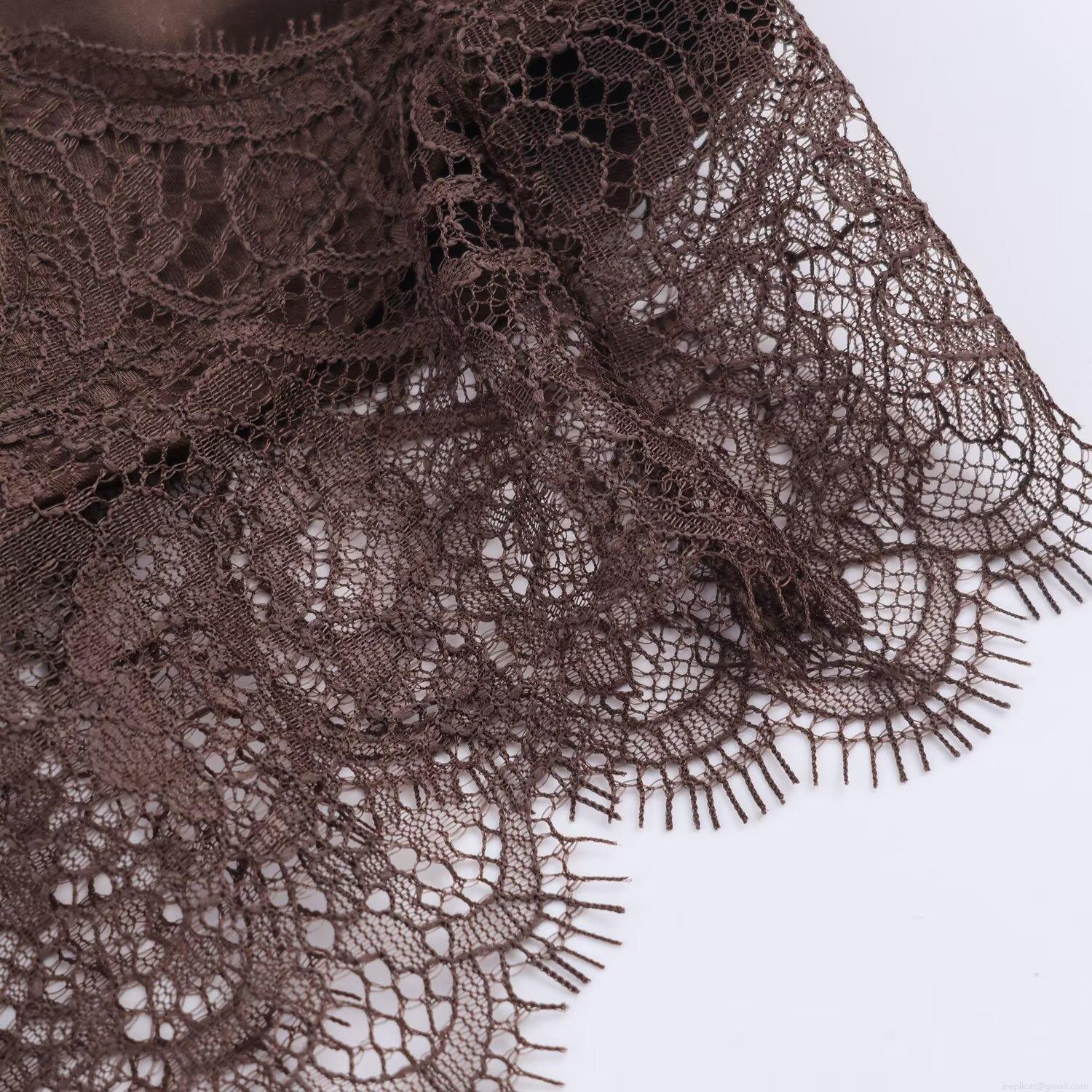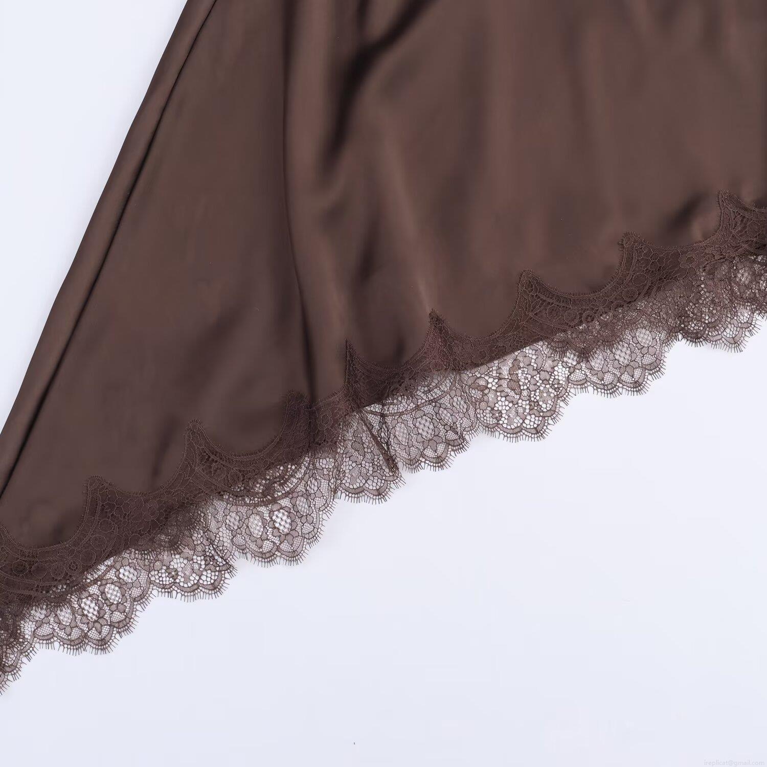 • Women's Sexy Deep Brown Satin Slip Midi Dress With Lace Trim V-Neck Asymmetric Hem Autumn Sleeveless Evening Party Dress For Women