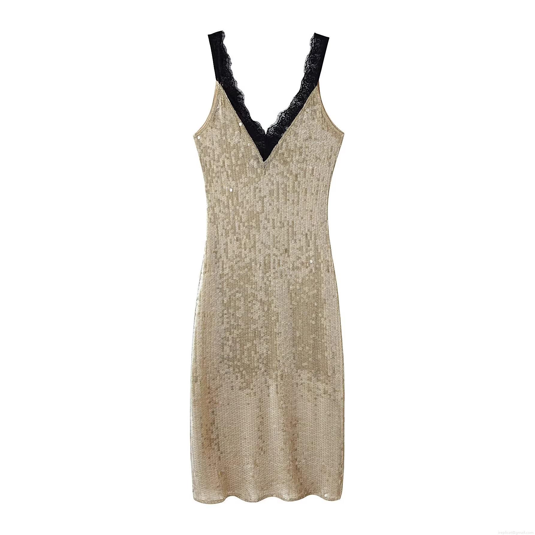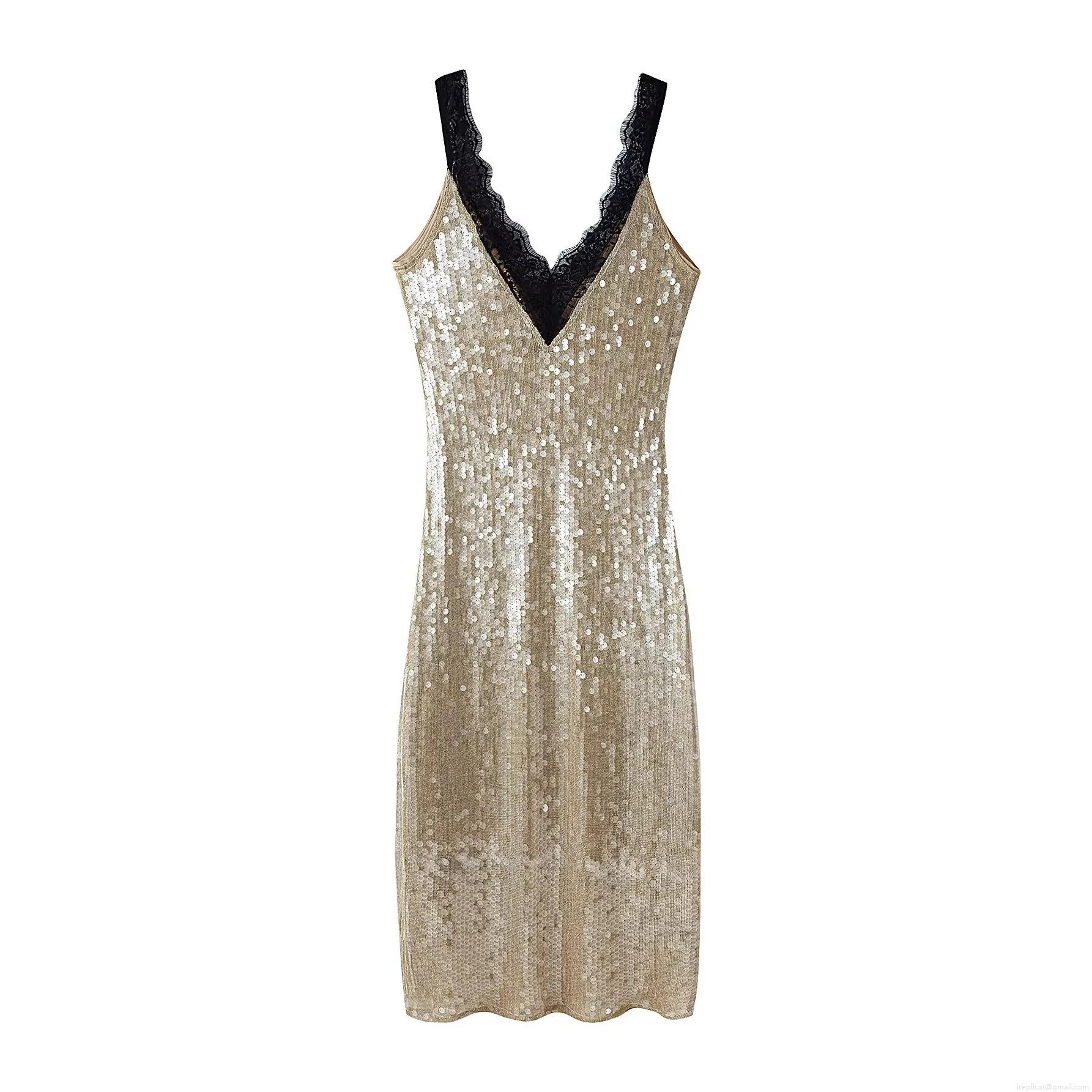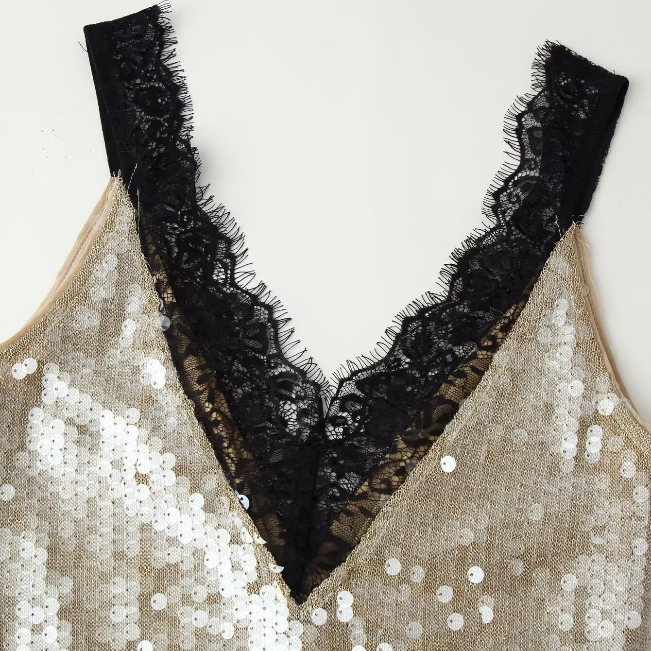 Women's Sexy Gold Sequin Cami Dress Elegant V-Neck Black Lace Splicing Midi Dress For Party Evening Clubwear Sleeveless Slim Fit Bodycon Gown
