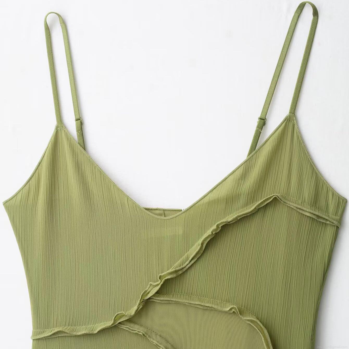 Women's Sexy Grass Green Patchwork Camisole Midi Dress Mesh Chiffon Ruffle V-Neck Sleeveless Sling Dress For Party Club Vacation Summer