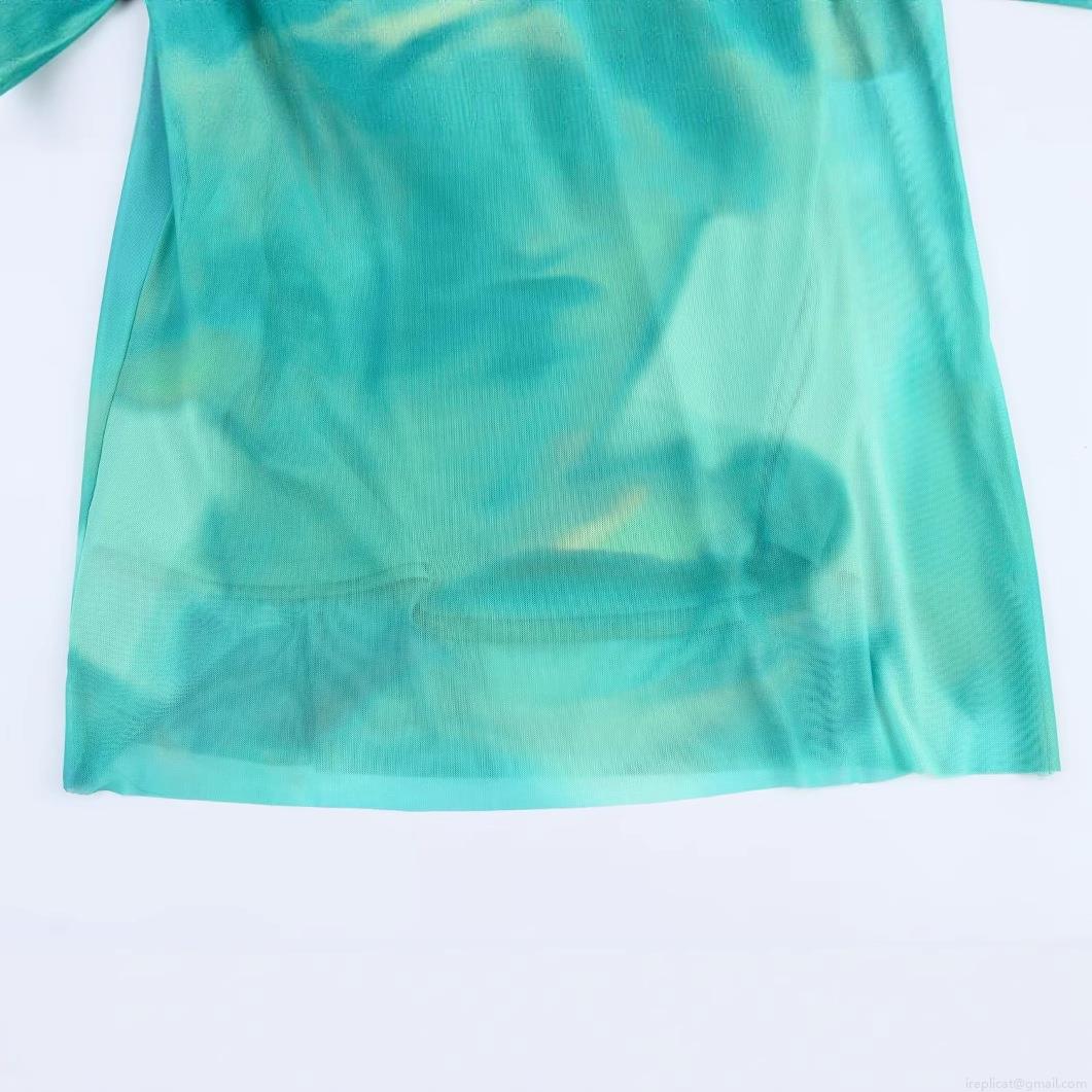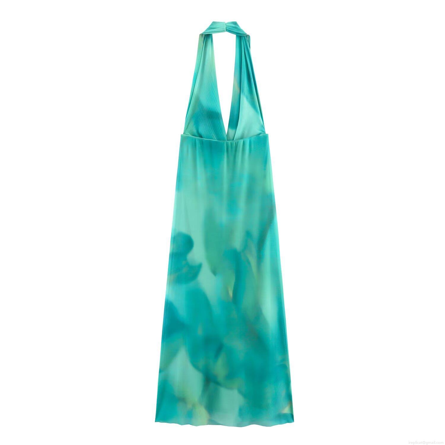 Women's Sexy Halter Backless Midi Dress Summer Beach Party Blue-green Gradient Print Polyester Mesh Dress Elegant Sleeveless Sundress For Women
