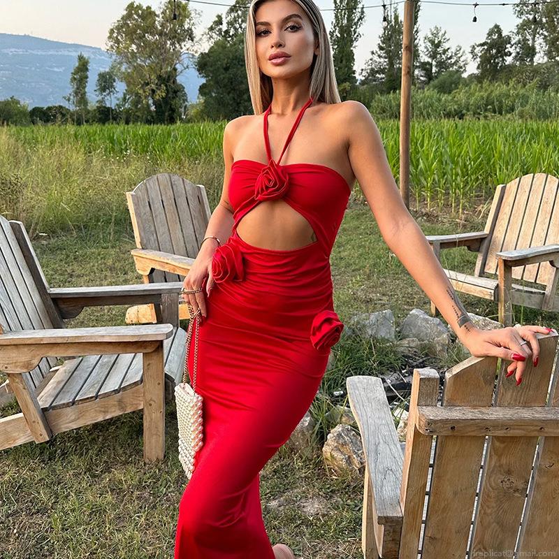 Women's Sexy Halter Neck 3D Rose Flower Bodycon Dress Milk Silk Hollow Out Backless Slit Maxi Dress For Summer Party Clubwear