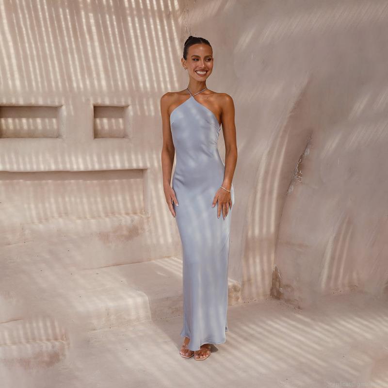 • Women's Sexy Halter Neck Backless Satin Maxi Dress Elegant Solid Color Slim Fit Sleeveless Criss-Cross Strap Evening Party Summer Long Dress