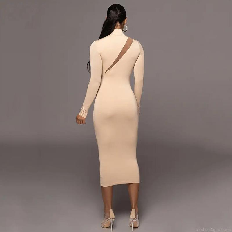 Women's Sexy Long Sleeve Mesh Patchwork Hollow Out Bodycon Midi Dress Elegant High Neck Slim Fit Polyester Evening Party Clubwear Streetwear Dresses