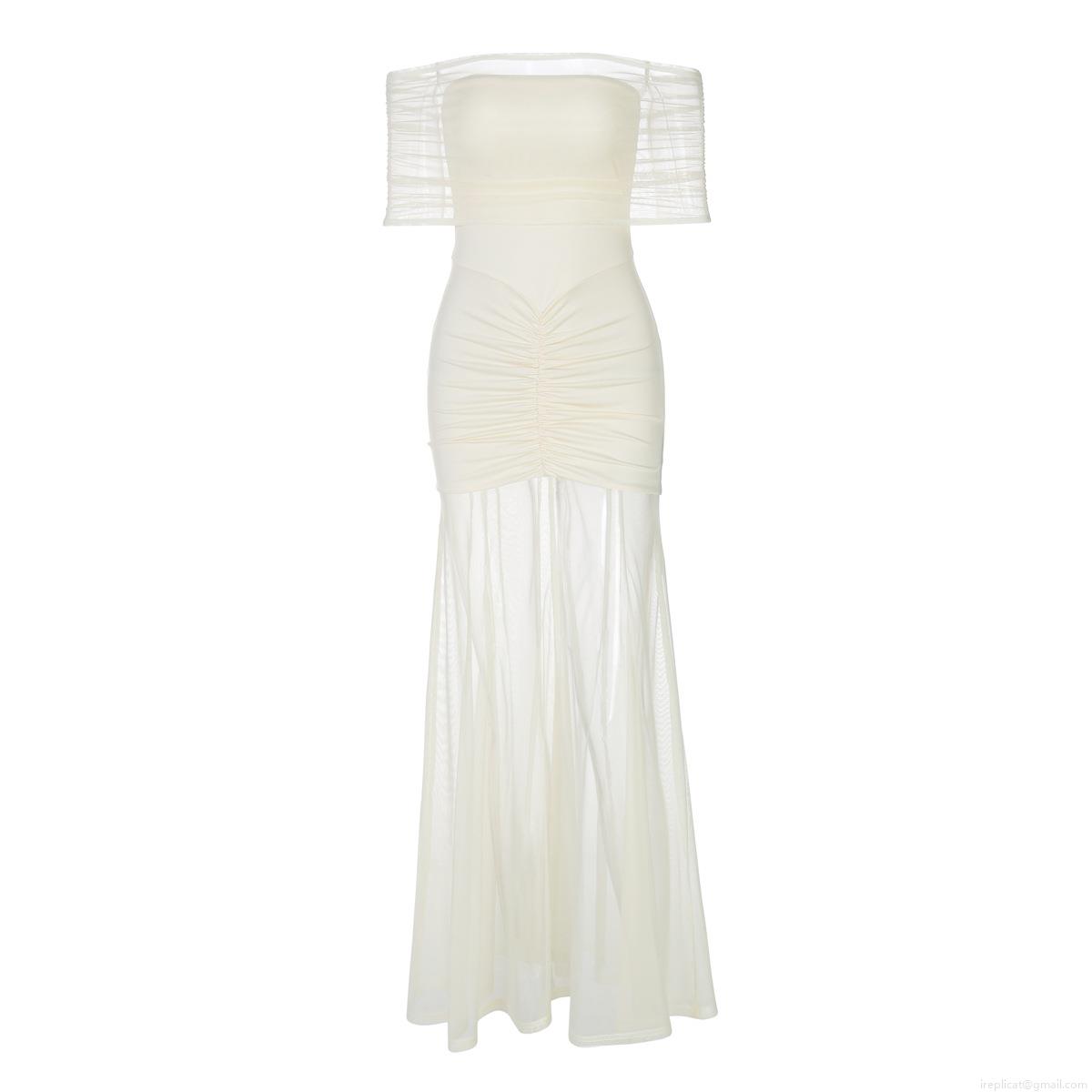 Solid Color, Pleats, Perspective, Mesh Splicing, Off-shoulder