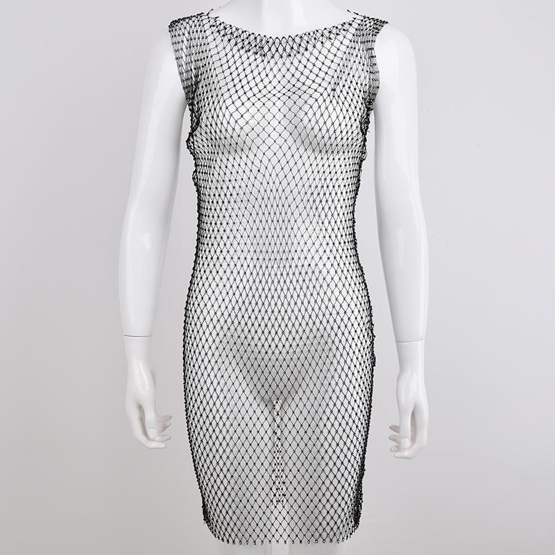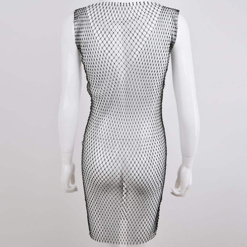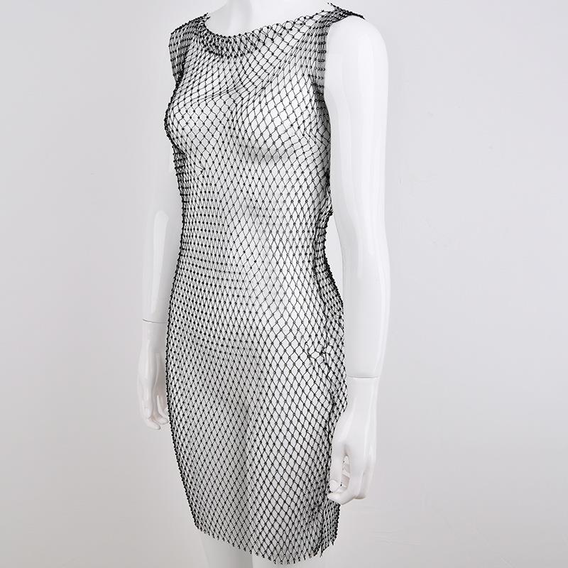 • Women's Sexy Rhinestone Mesh Midi Dress Sleeveless Round Neck Bodycon Clubwear Party Night Out See Through Fishnet Dress
