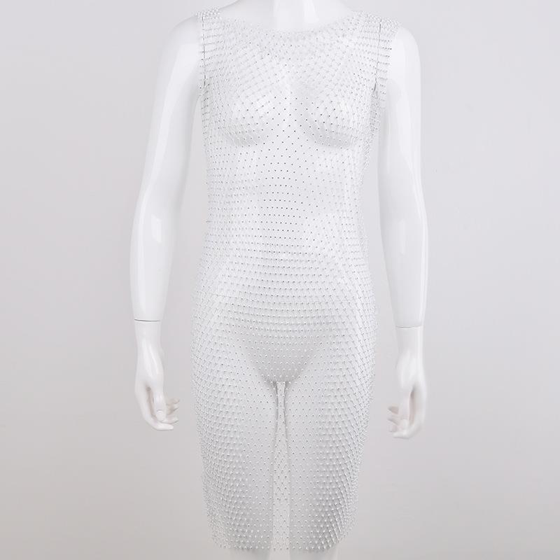 Women's Sexy Rhinestone Mesh Midi Dress Sleeveless Round Neck Bodycon Clubwear Party Night Out See Through Fishnet Dress