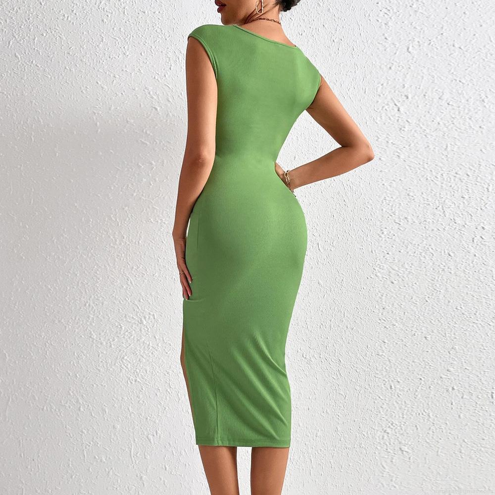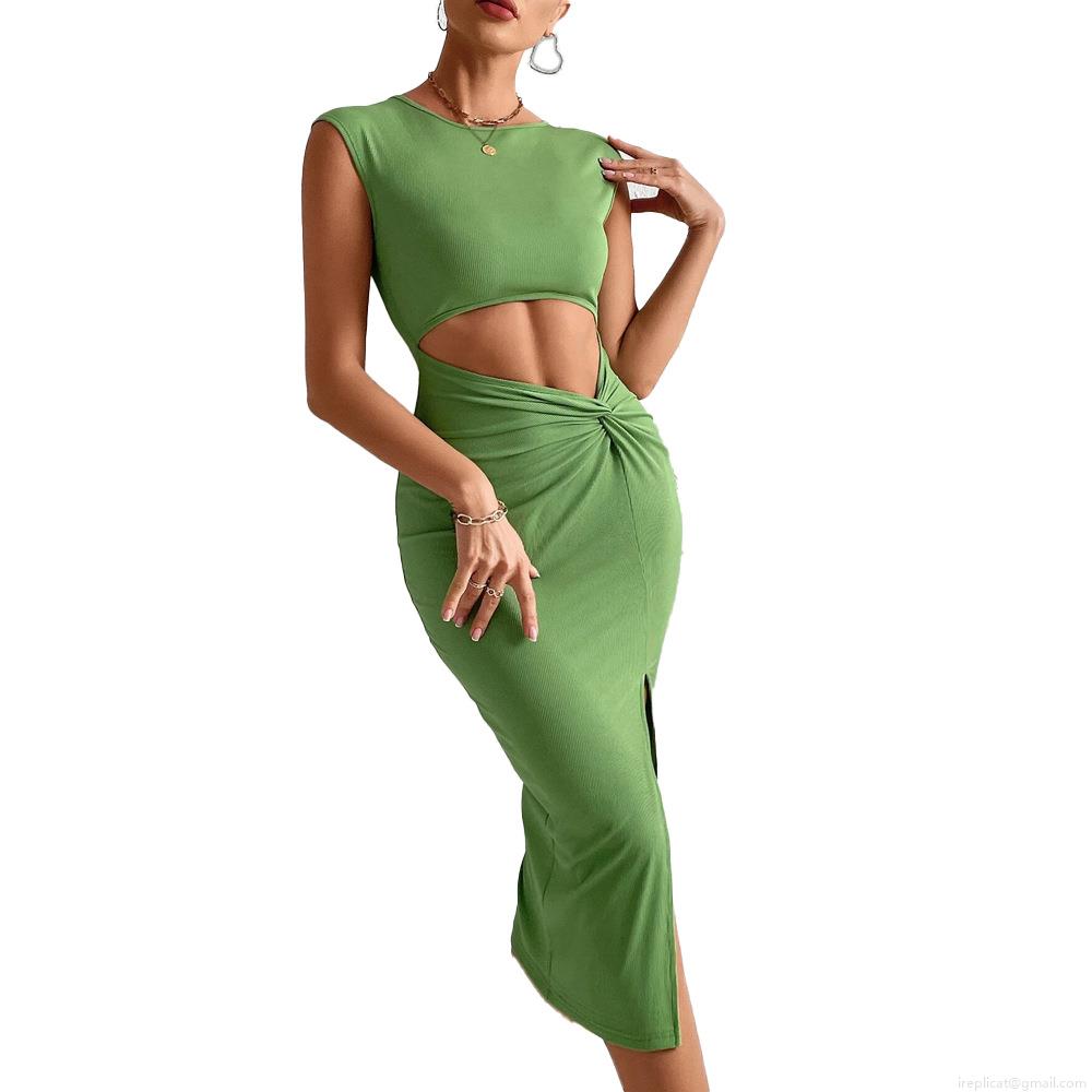 • Women's Sexy Ribbed Knit Midi Dress Cut Out Knot Waist Sleeveless High Slit Bodycon Dress Solid Color Elegant Summer Vacation Outfits