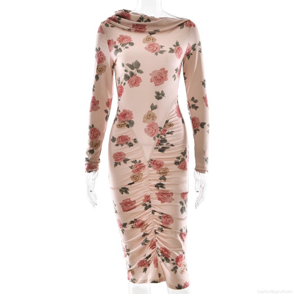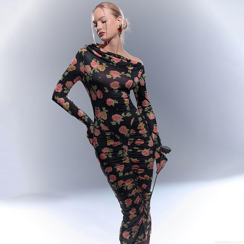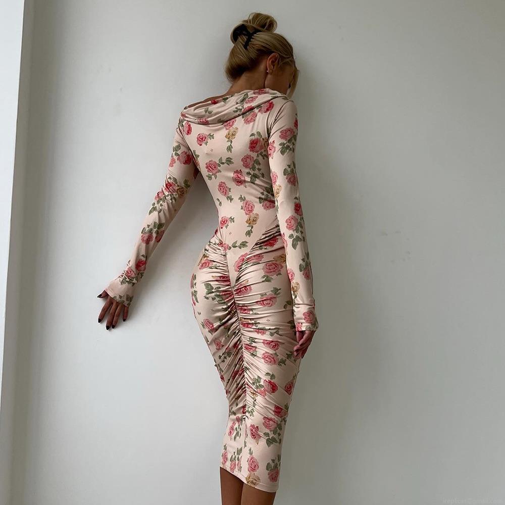 • Women's Sexy Rose Floral Print Long Sleeve Bodycon Midi Dress With Ruching Off Shoulder Drape Neck Polyester Streetwear Party Clubwear Outfit