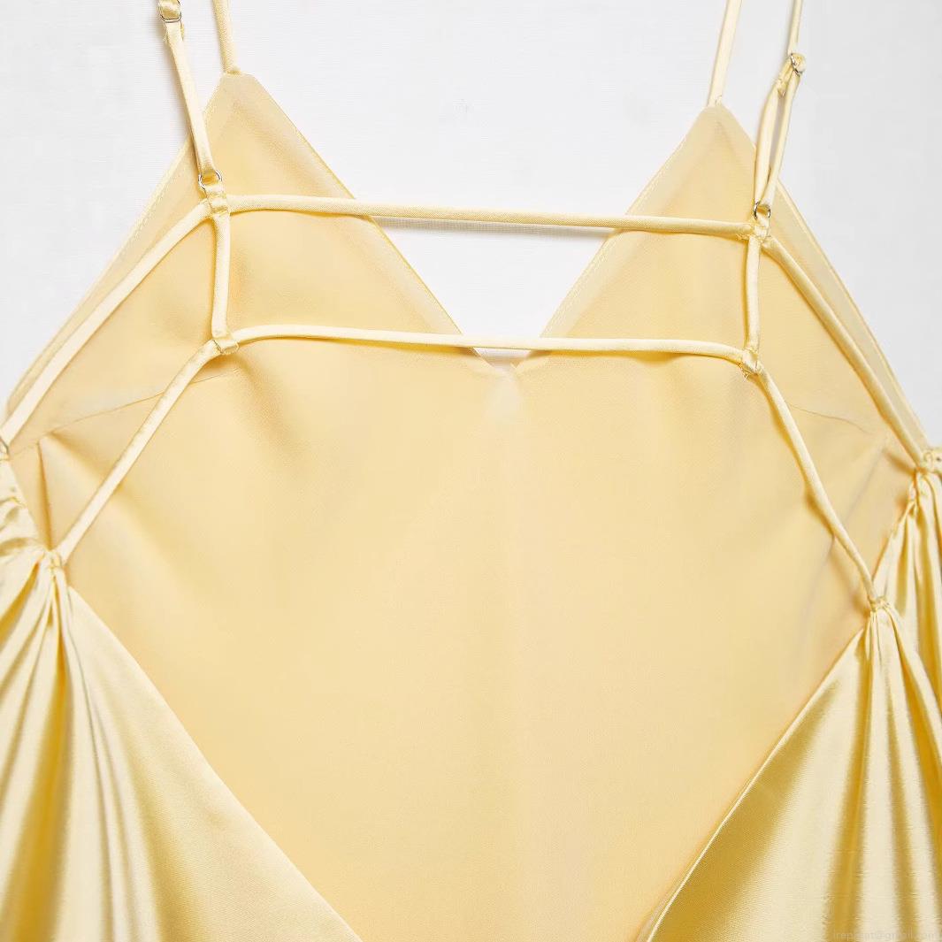 Women's Sexy Satin Backless Midi Dress Spaghetti Strap V-Neck Solid Yellow Silk Texture Evening Party Cocktail Summer Elegant Long Dress