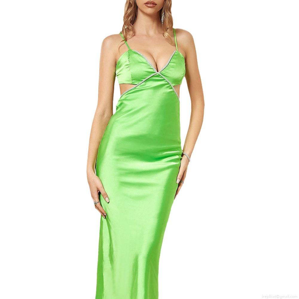 • Women's Sexy Satin Midi Dress Deep V-Neck Backless Spaghetti Strap Cut-Out Waist With Rhinestone Trim Slim Fit Party Banquet Elegant Neon Green Sleeveless Bodycon Dress