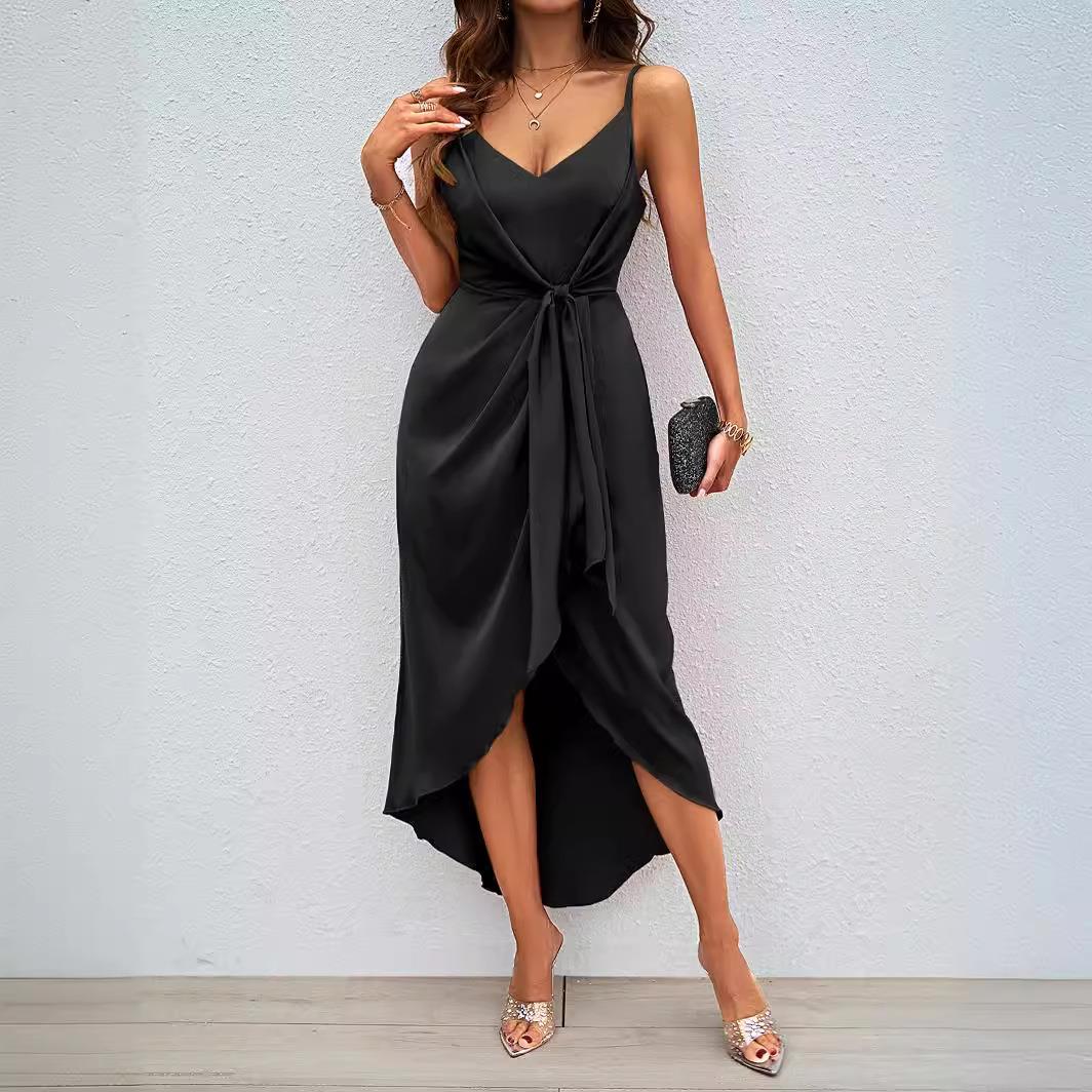 • Women's Sexy Satin V Neck Cami Dress Elegant Backless Tie Waist Asymmetrical High Low Hem Solid Color Summer Party Evening Maxi Slip Dress