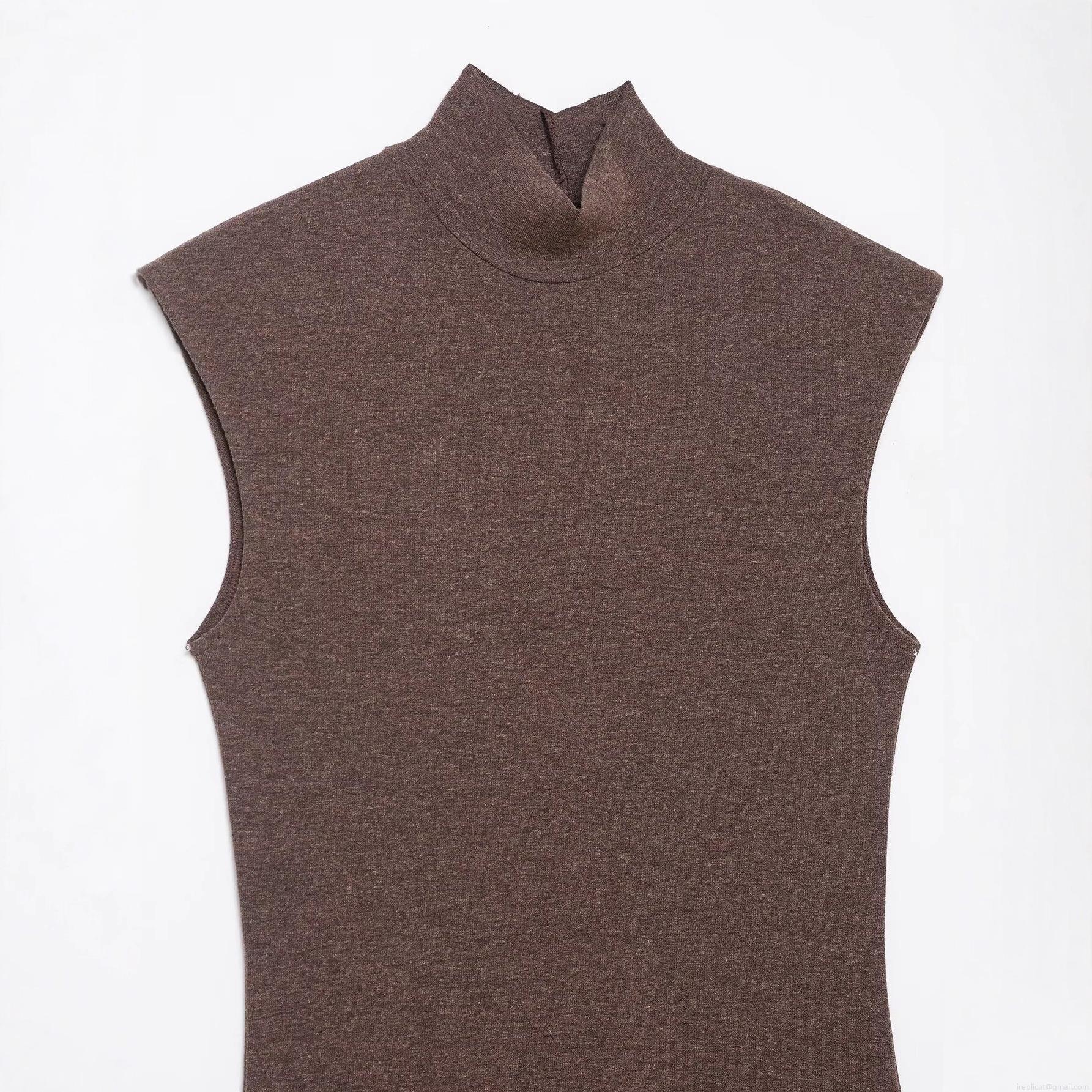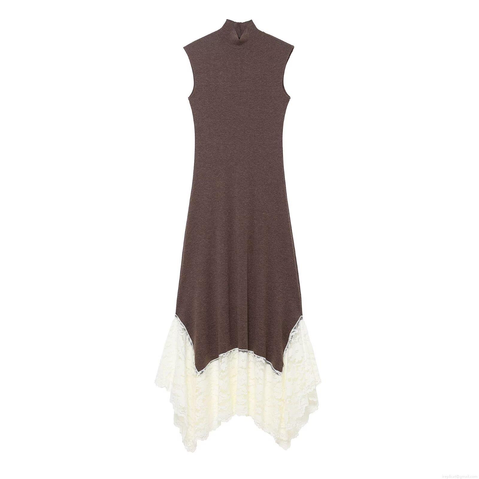 Women's Sexy Semi-High Neck Spliced Lace Irregular Hem Sleeveless Midi Dress Elegant Knitted Bodycon Dress Dark Brown White Splicing Evening Party Dress