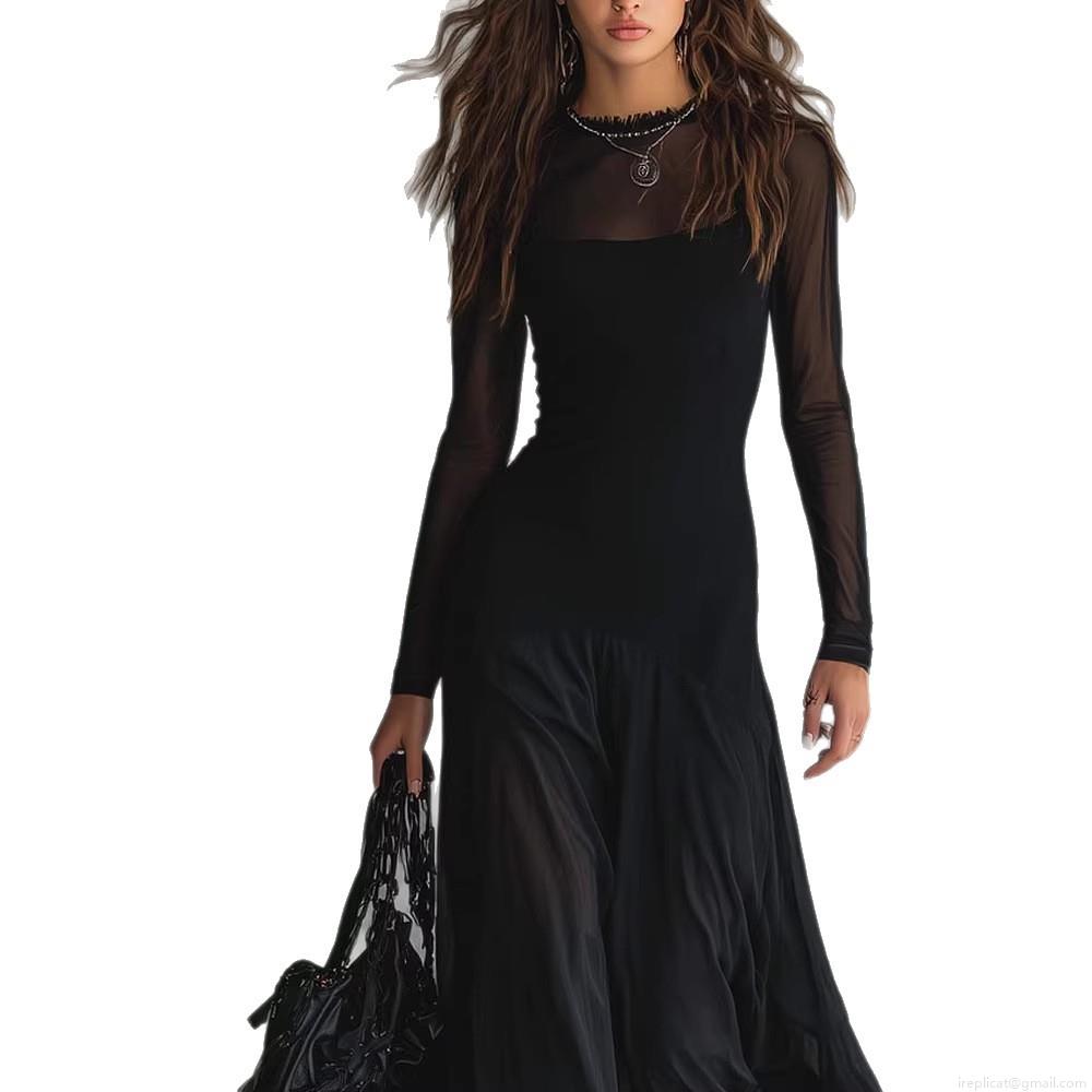 • Women's Sexy Sheer Mesh Patchwork Bodycon Midi Dress Long Sleeve Elegant Ruched Black Pencil Dress For Party Clubwear Evening Lady Clothing