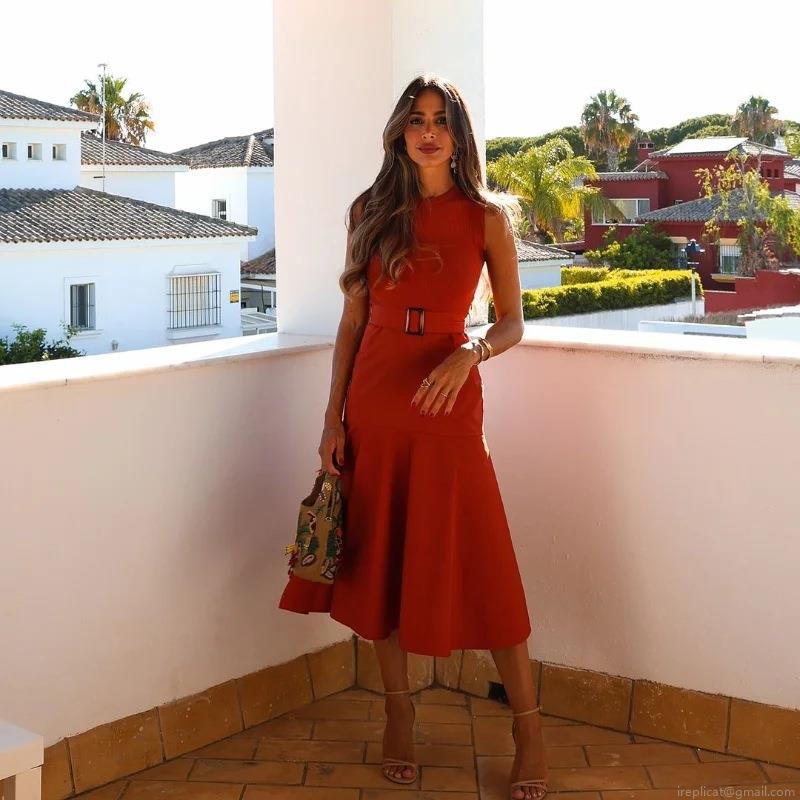 Women's Sexy Sleeveless Patchwork Midi Dress With Belt Ribbed Knit Top And Woven Skirt Elegant Slim Fit One-Step Dress For Summer Party Vacation