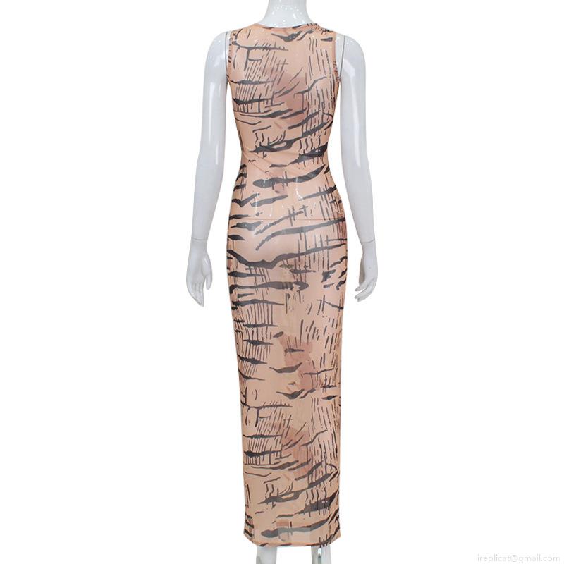 Women's Sexy Sleeveless Tiger Print Mesh Bodycon Midi Dress Elegant Slim Fit Round Neck Tank Long Dress Party Streetwear