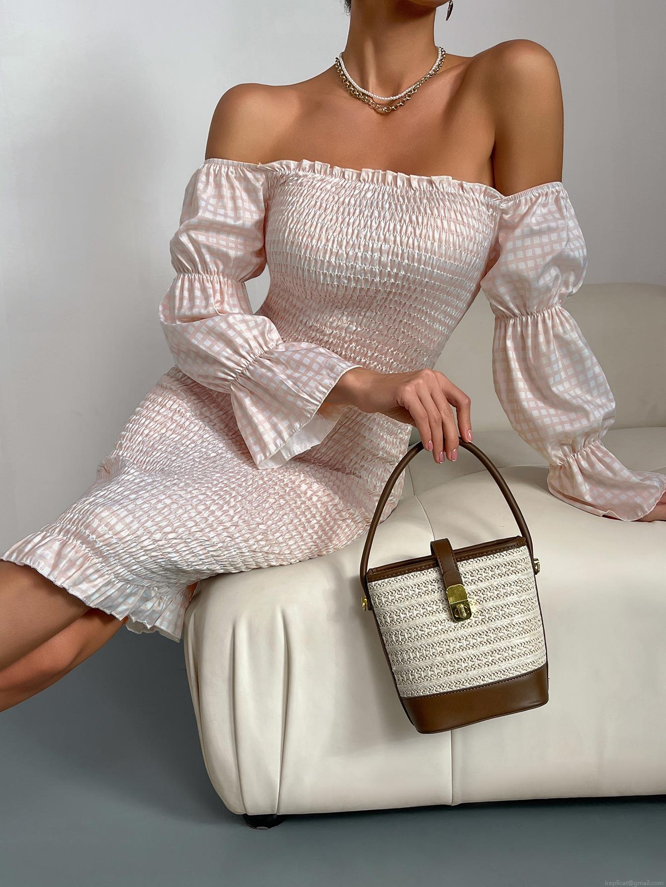 Women's Sexy Smocked Polyester Spandex Off-The-Shoulder Dress Pink Gingham Long Flare Sleeve Slim Fit Bodycon Midi Dress for Party Elegant Summer Clubwear