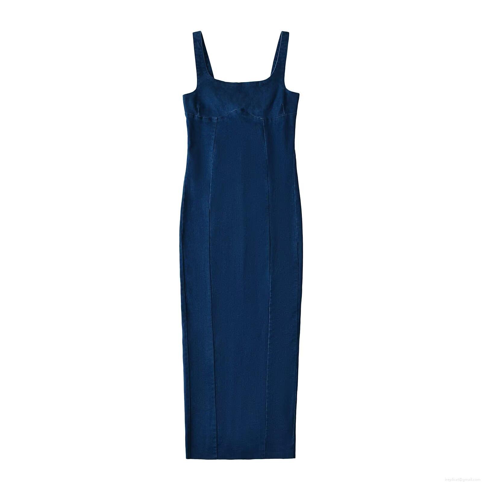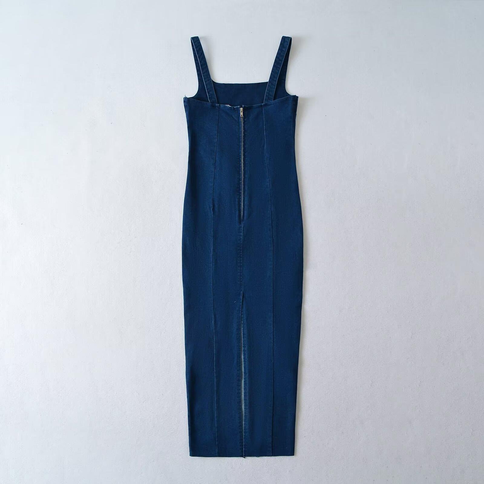 • Women's Sexy Square Neck Denim Bodycon Dress Sleeveless Back Zipper Split Midi Jeans Dress For Streetwear Party Elegant Slim Fit Sling Long Dress Blue
