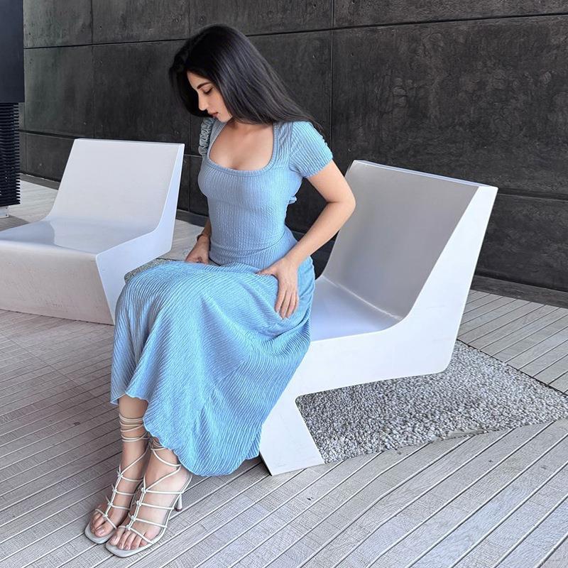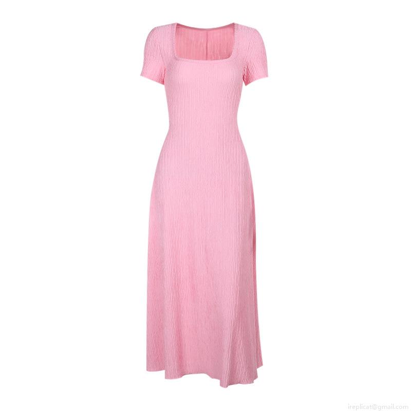 • Women's Sexy Square Neck Short Sleeve Midi Dress With Side Slit Pleated Textured Polyester Spandex Back Cross Tie A-Line Summer Casual Party Long Dress