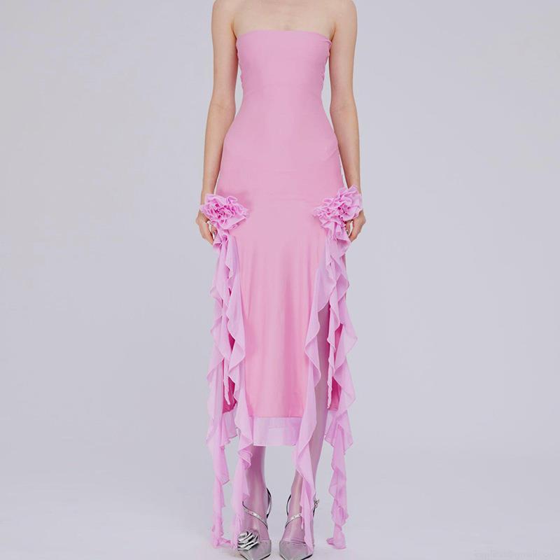 Women's Sexy Strapless Bodycon Midi Dress Elegant Polyester Spandex High Split Ruffle Trim Floral Decor Evening Party Banquet Wedding Guest Dress