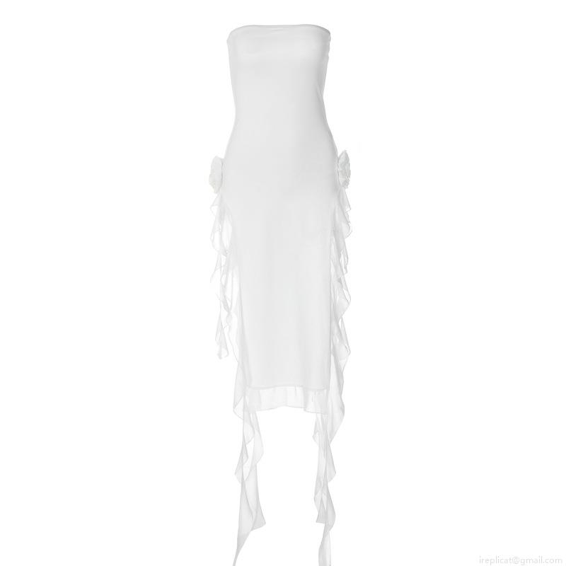 • Women's Sexy Strapless Bodycon Midi Dress Elegant Polyester Spandex High Split Ruffle Trim Floral Decor Evening Party Banquet Wedding Guest Dress