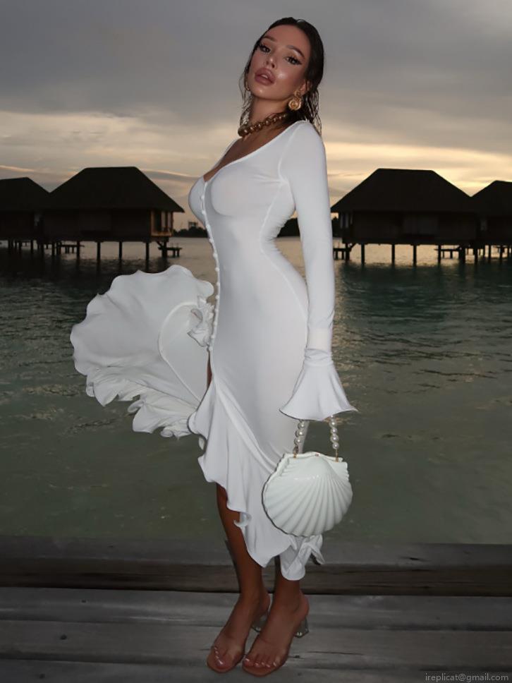 • Women's Sexy V Neck High Slit Midi Dress Elegant Long Sleeve Button Ribbed Knit Bodycon Dress Solid Color Ruffle Cuff Party Evening Gown