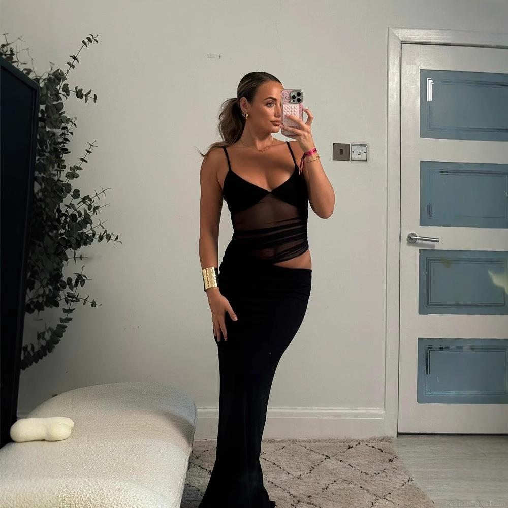 • Women's Sexy V-Neck Mesh Patchwork Midi Dress Elegant Hollow Out Bodycon Strap Dress For Party Evening Clubwear Solid Black Sleeveless Dress
