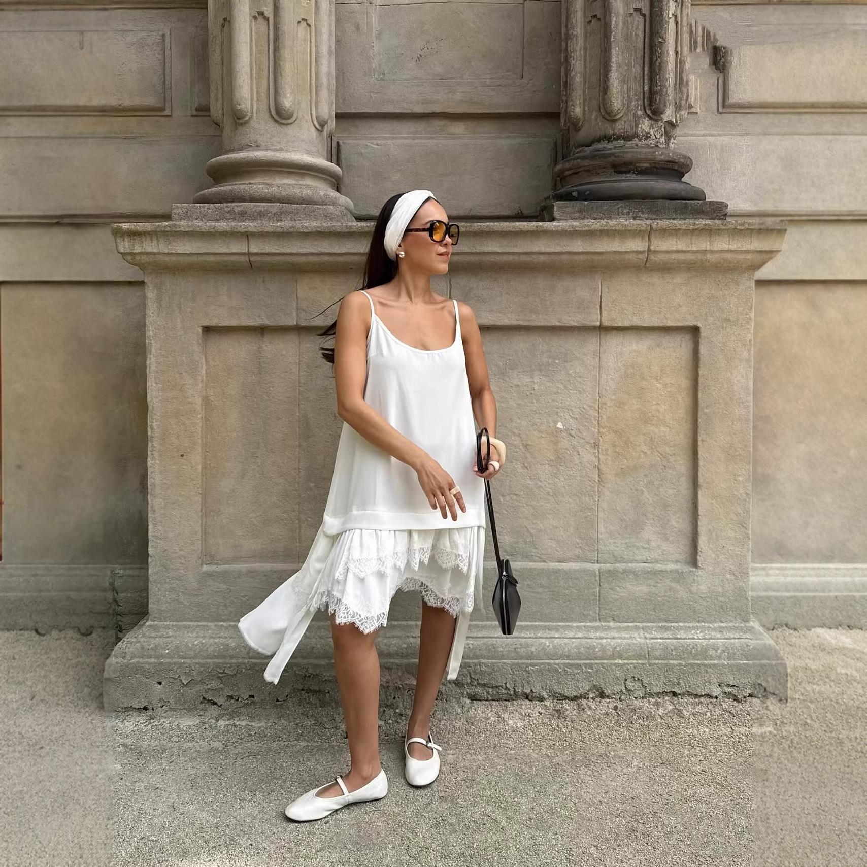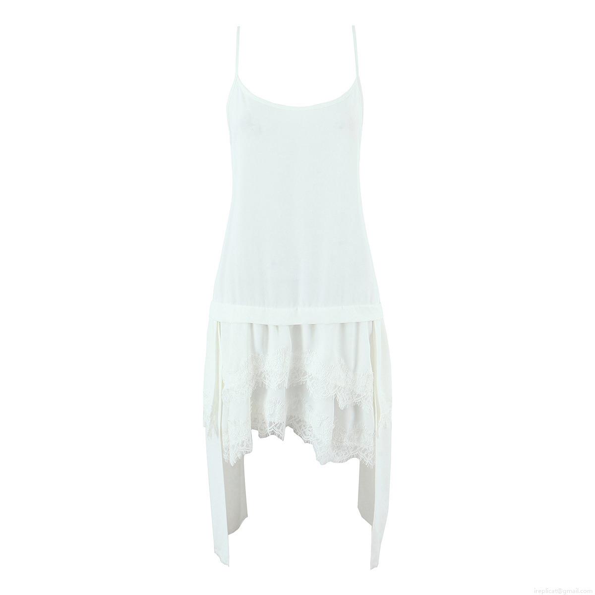 • Women's Sexy White Lace Patchwork Spaghetti Strap Dress Sleeveless U-Neck Layered Asymmetrical Hem Midi Dress For Summer Party Streetwear