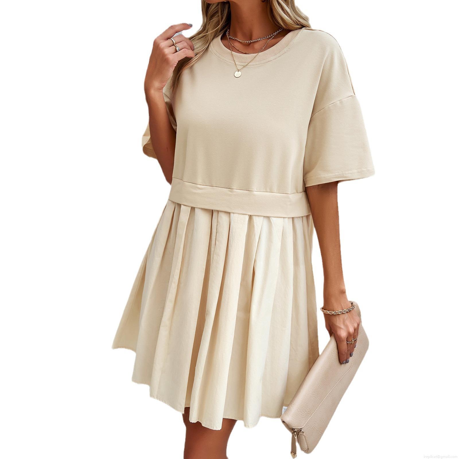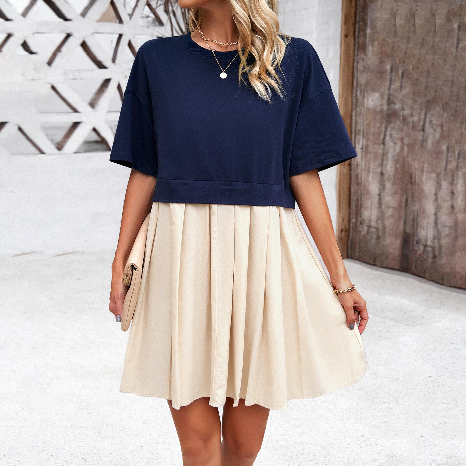 Women's Short Sleeve Pleated Dress Two-Tone Patchwork Round Neck Midi T-Shirt Dress For Summer Casual Party Elegant Ladies Fashion