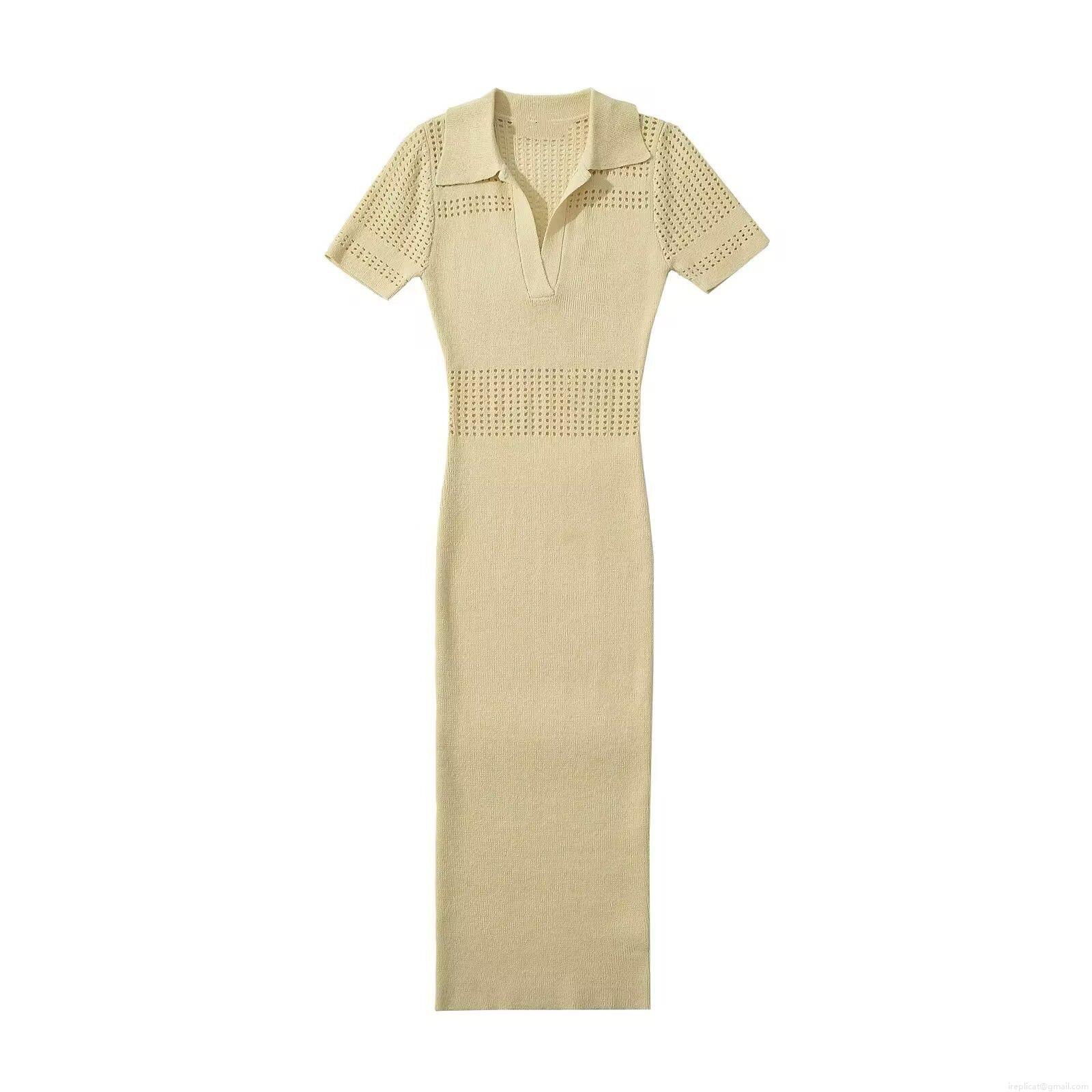 • Women's Short Sleeve Polo Collar Knit Midi Dress Hollow Out Crochet Bodycon Slim Fit Solid Color Streetwear Summer Autumn Dress