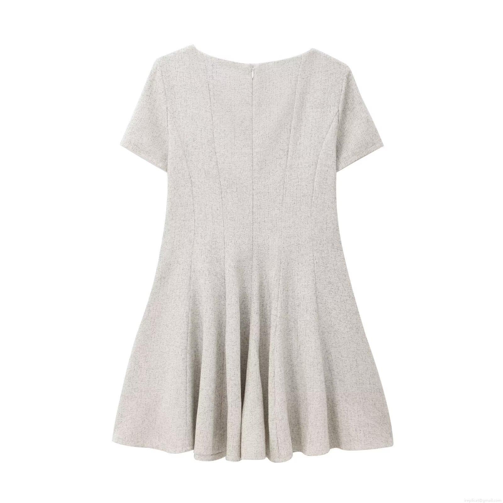 • Women's Short Sleeve Tweed Textured Dress Elegant Round Neck Slim Fit A-Line Wide Hem Midi Dress Beige Socialite Style Summer Spring Outfit