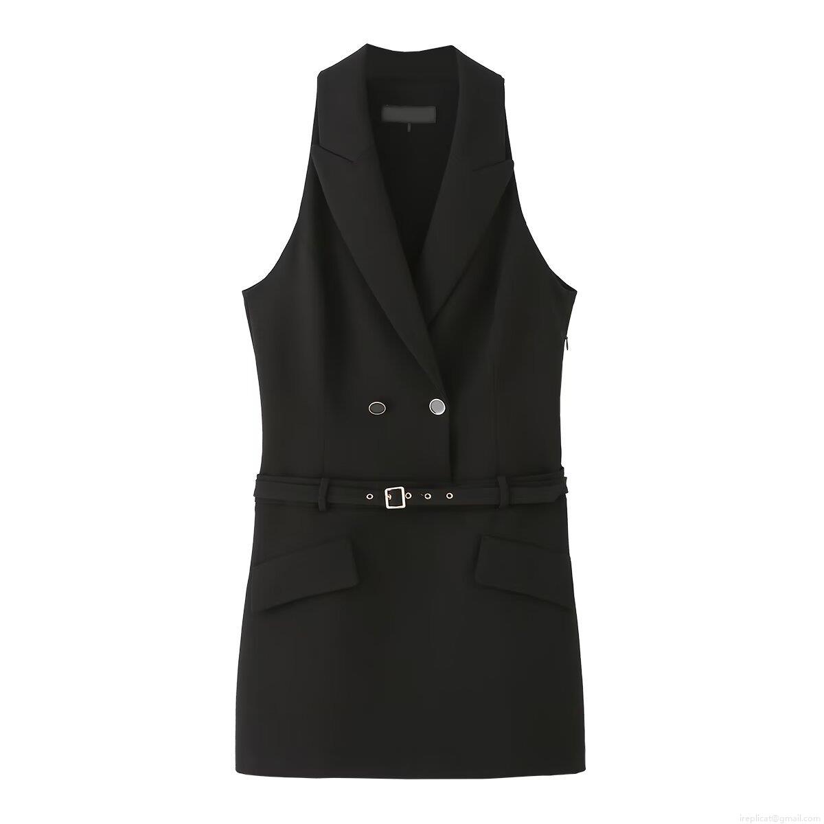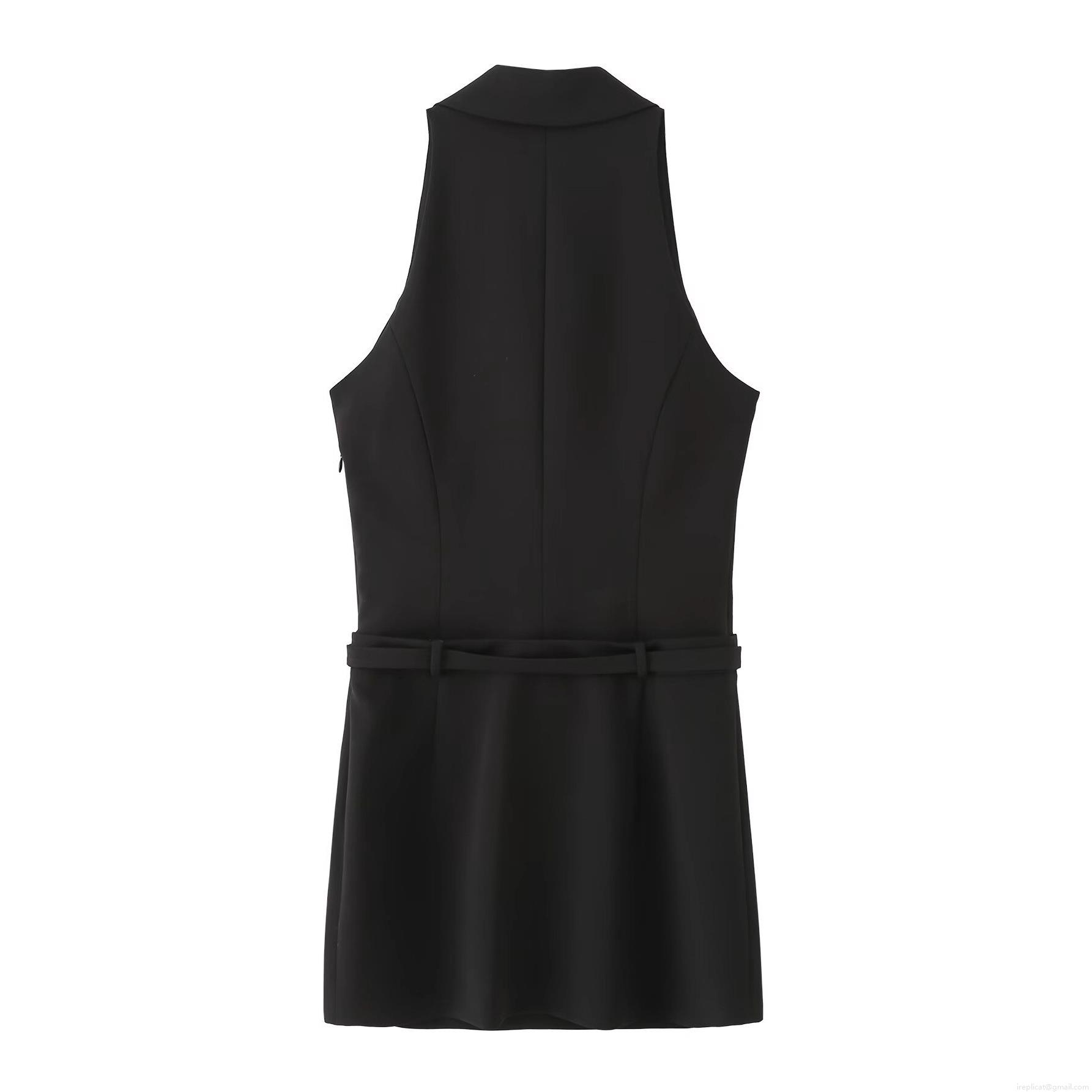 Women's Sleeveless Blazer Dress Elegant Double Breasted Vest Dress With Belt Office Lady Solid Color Midi Dress 100% Polyester Outfit