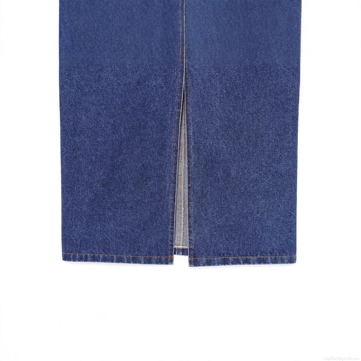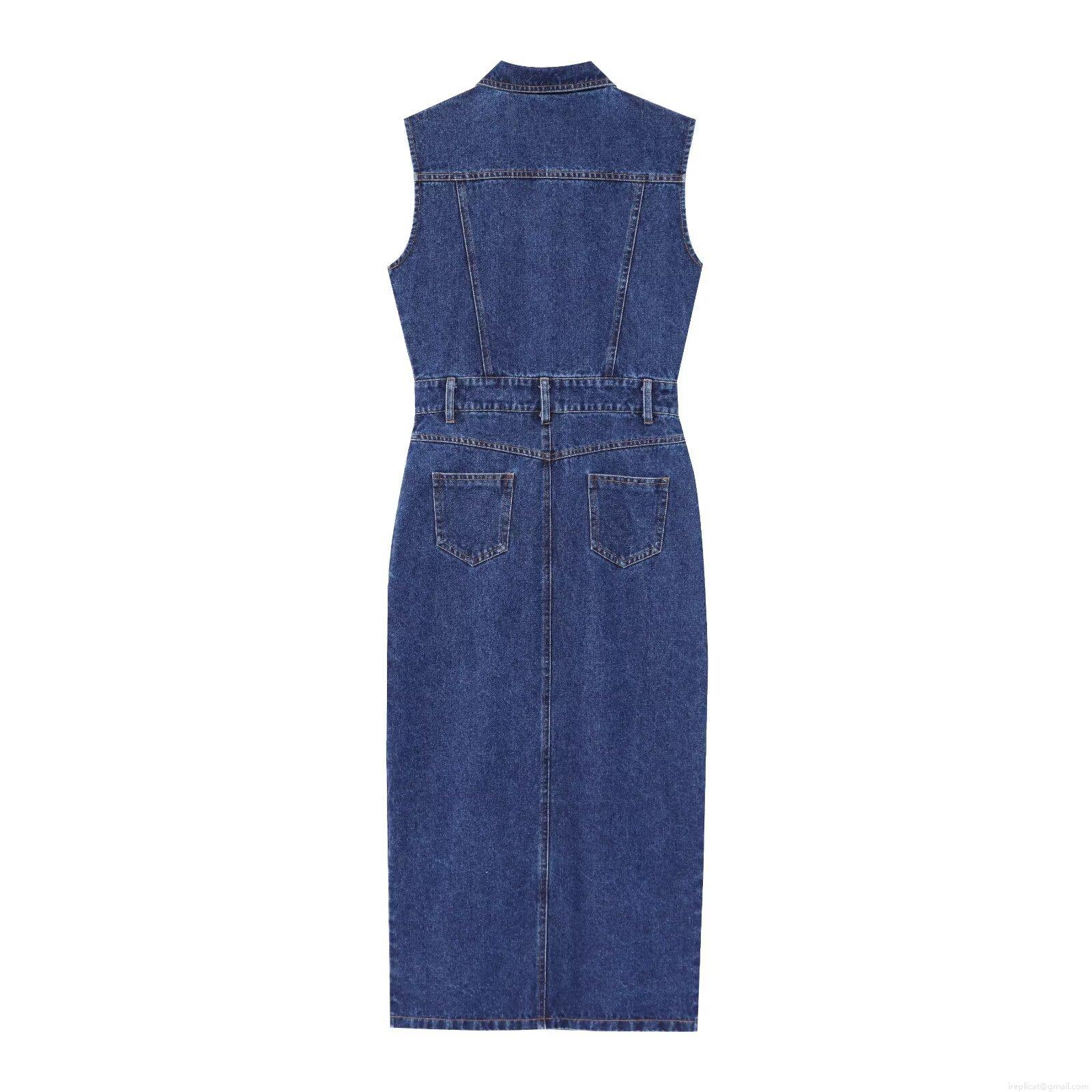 Women's Sleeveless Denim Midi Dress Navy Blue Single Breasted Shirt Collar Front Slit Long Jean Dress Elegant Lady Casual Clothing