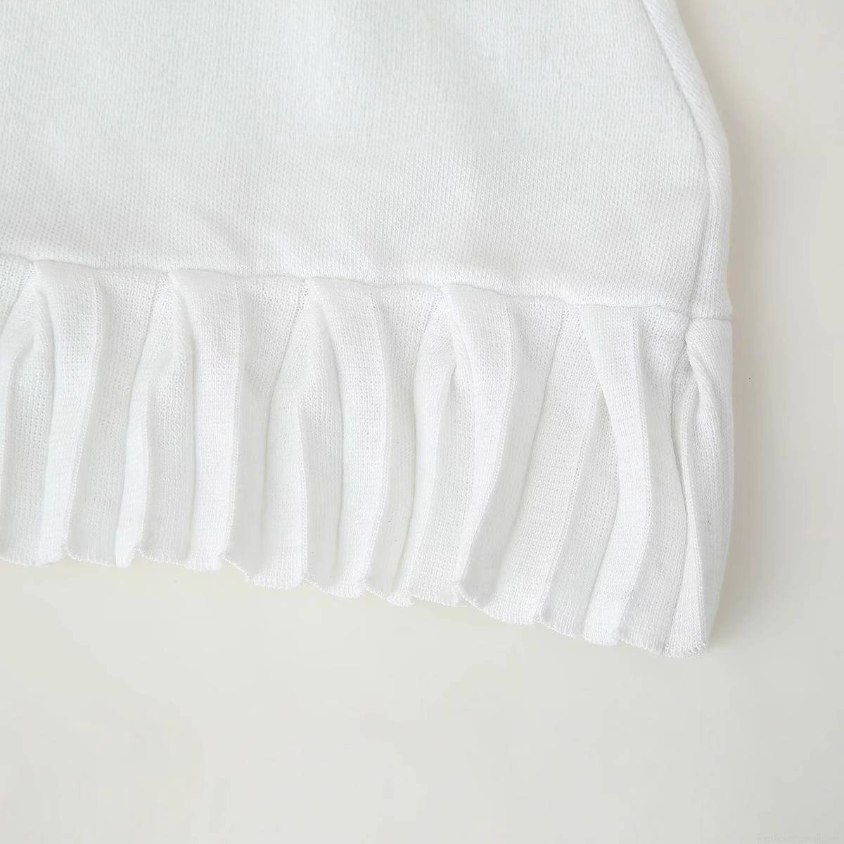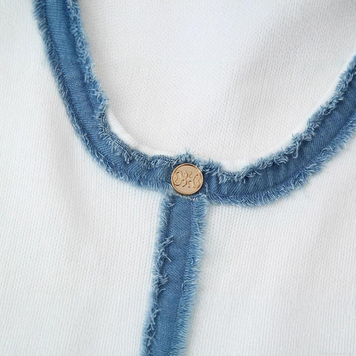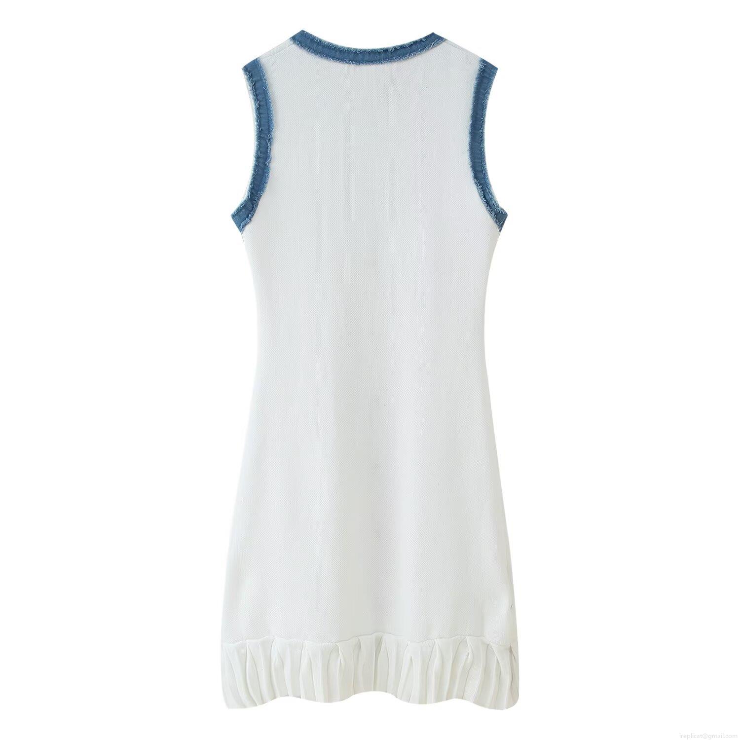Women's Sleeveless Knitted Midi Dress Contrast Denim Frayed Trim Pleated Hem Retro Gold Buttons Round Neck Streetwear Slim Fit Summer Fashion Dress