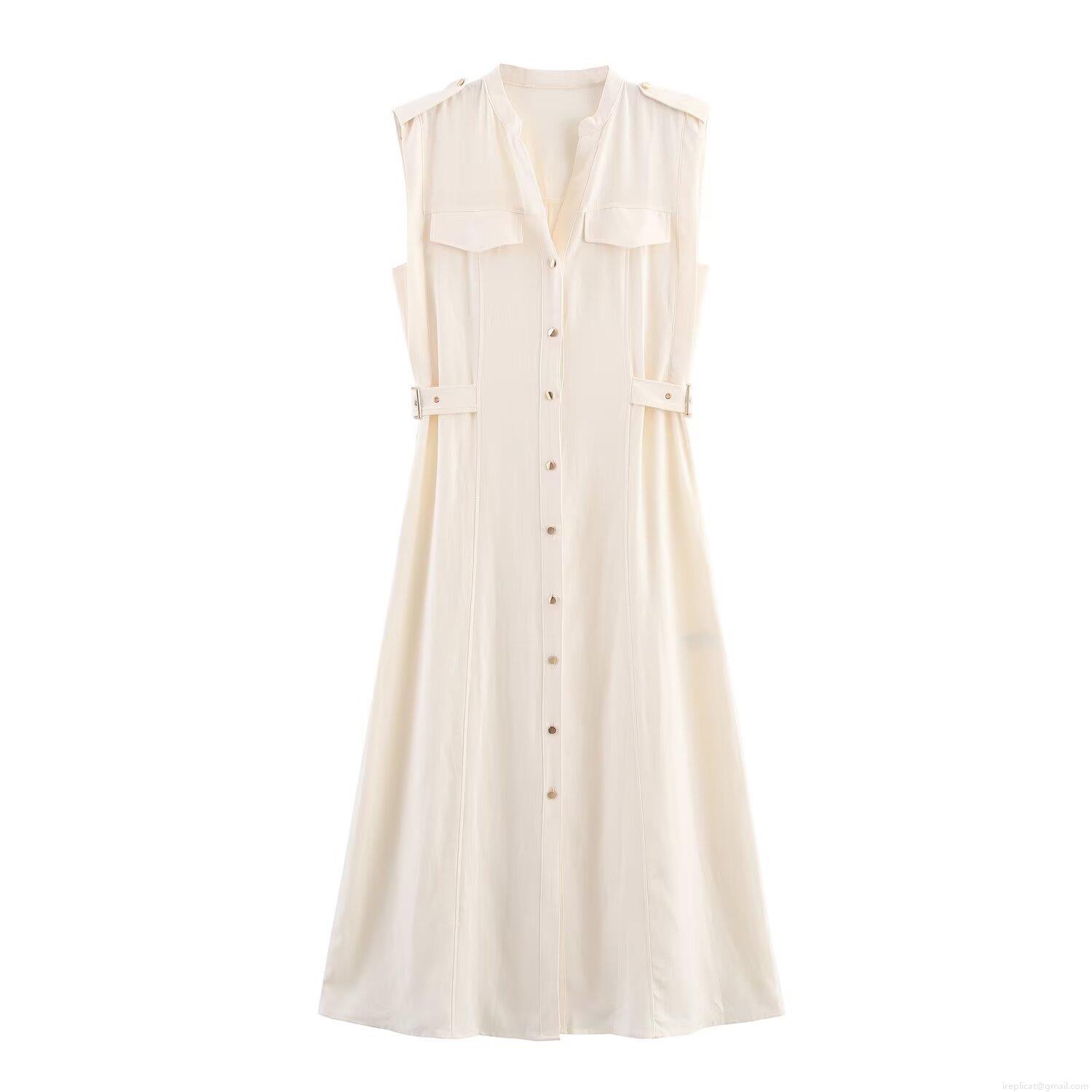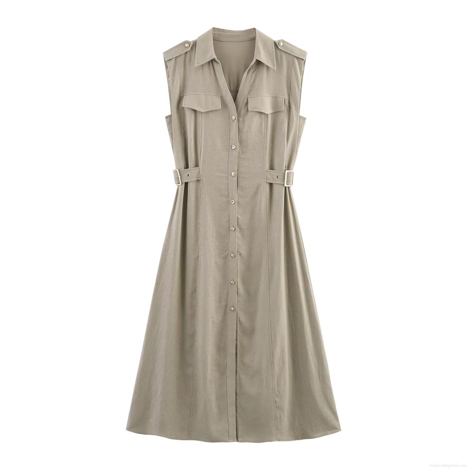 • Women's Sleeveless Linen Shirt Dress Utility Midi Length Button Down Lapel Collar Dress With Chest Pockets And Adjustable Waist Buckles Casual Elegant Workwear Dress