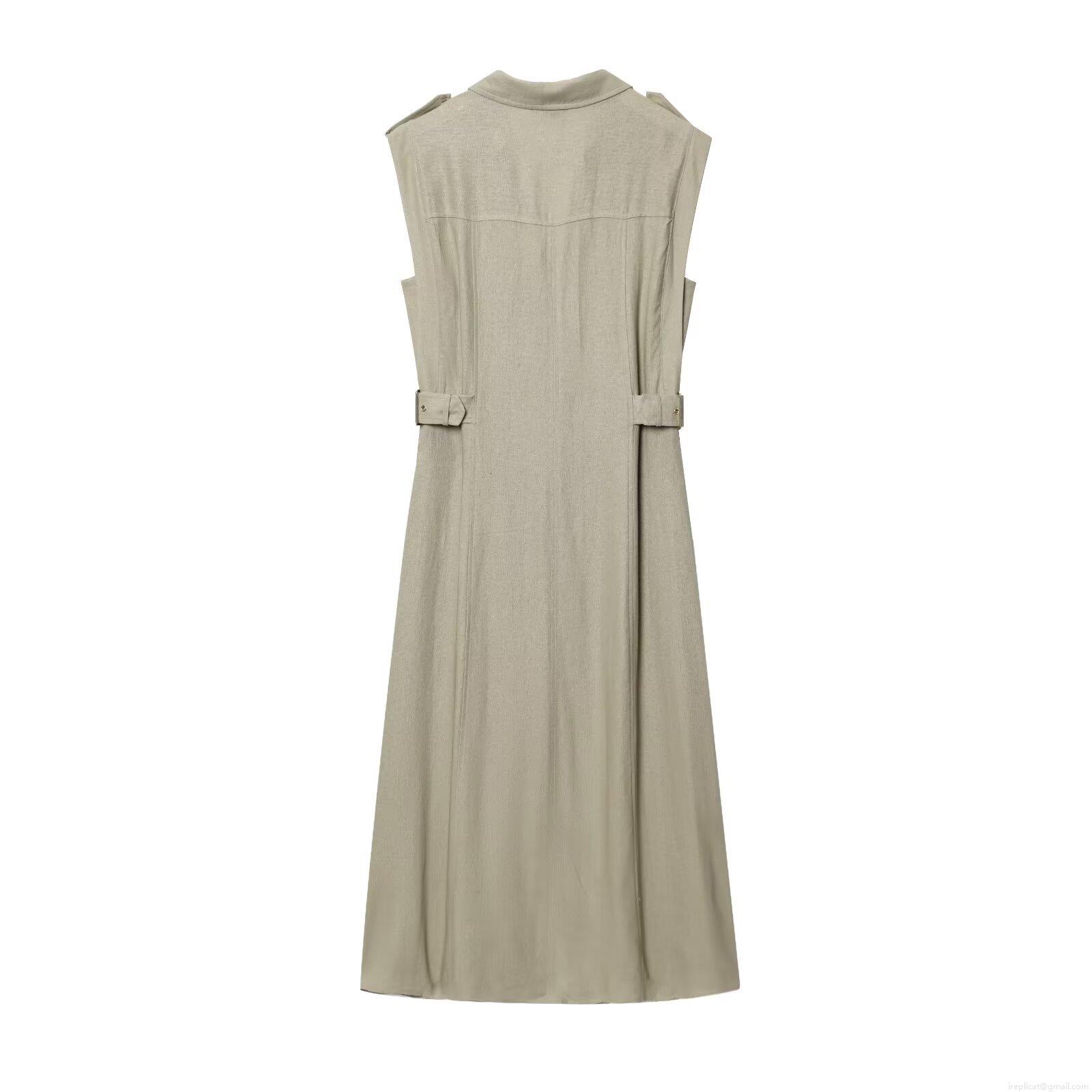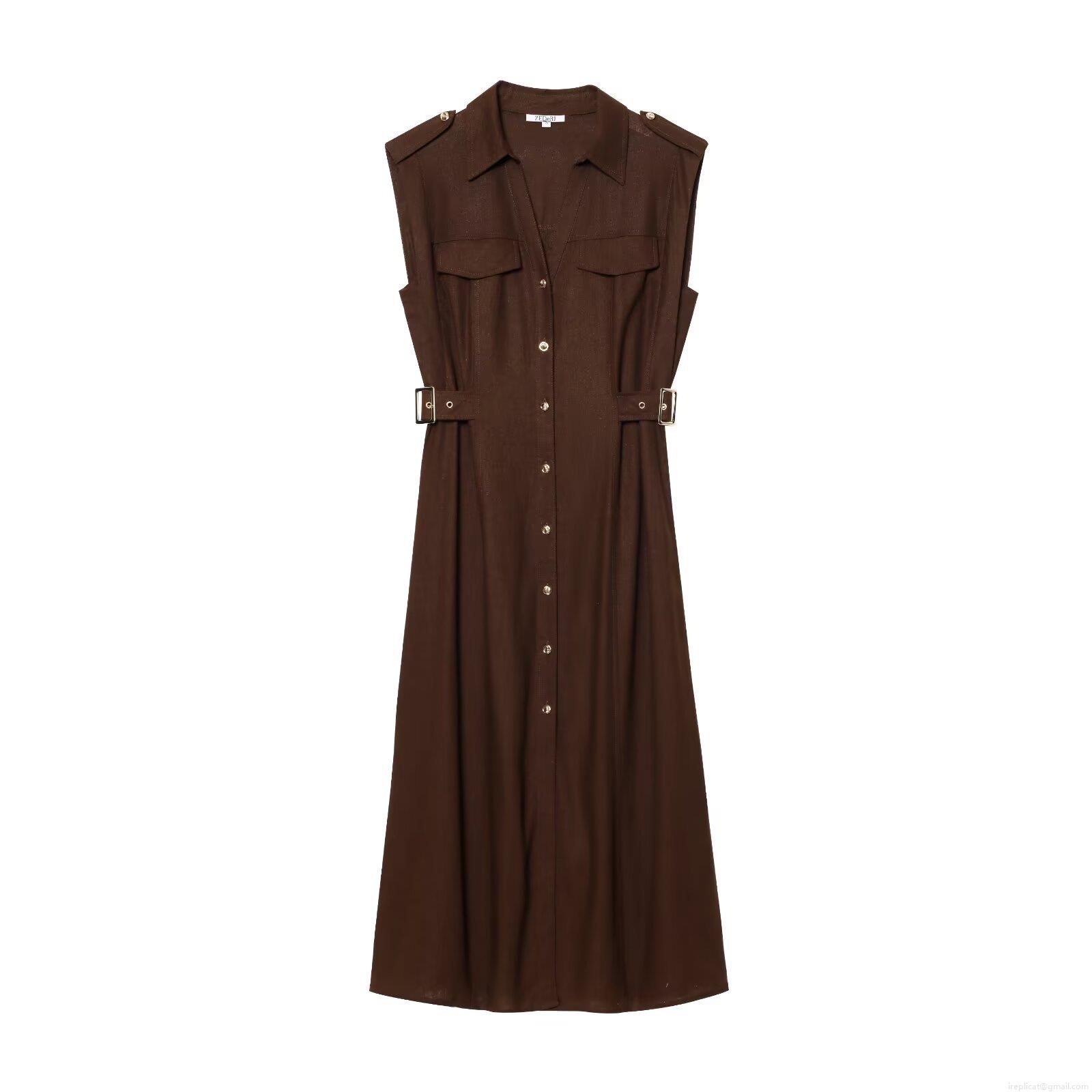• Women's Sleeveless Linen Texture Shirt Dress Elegant Lapel Button Down Midi Dress With Pockets Casual Workwear Vestidos