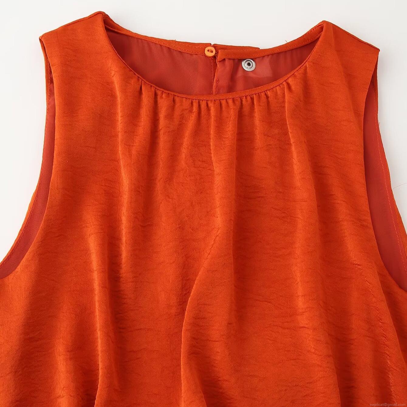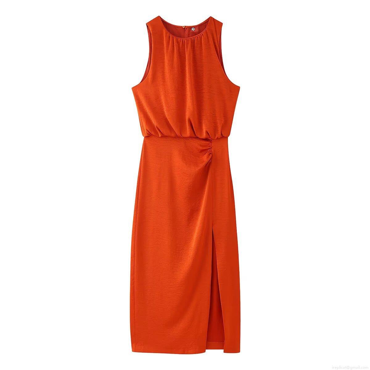 • Women's Sleeveless Midi Dress Polyester Silk Satin Textured Ruched Side Slit Bodycon Pullover Round Neck Summer Party Elegant Dress For Lady