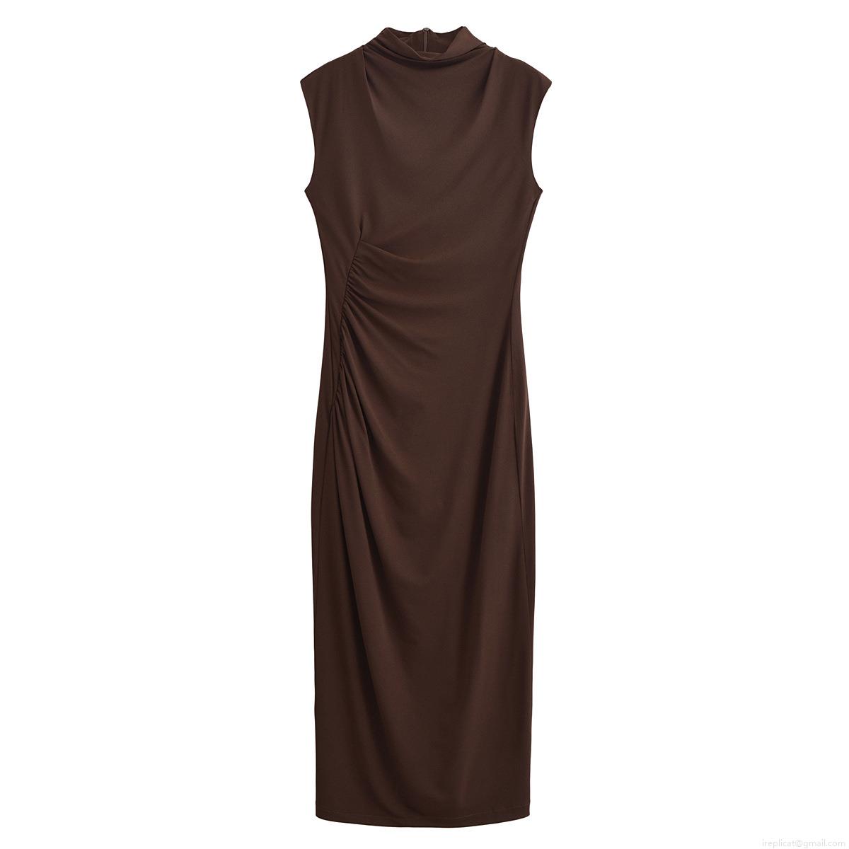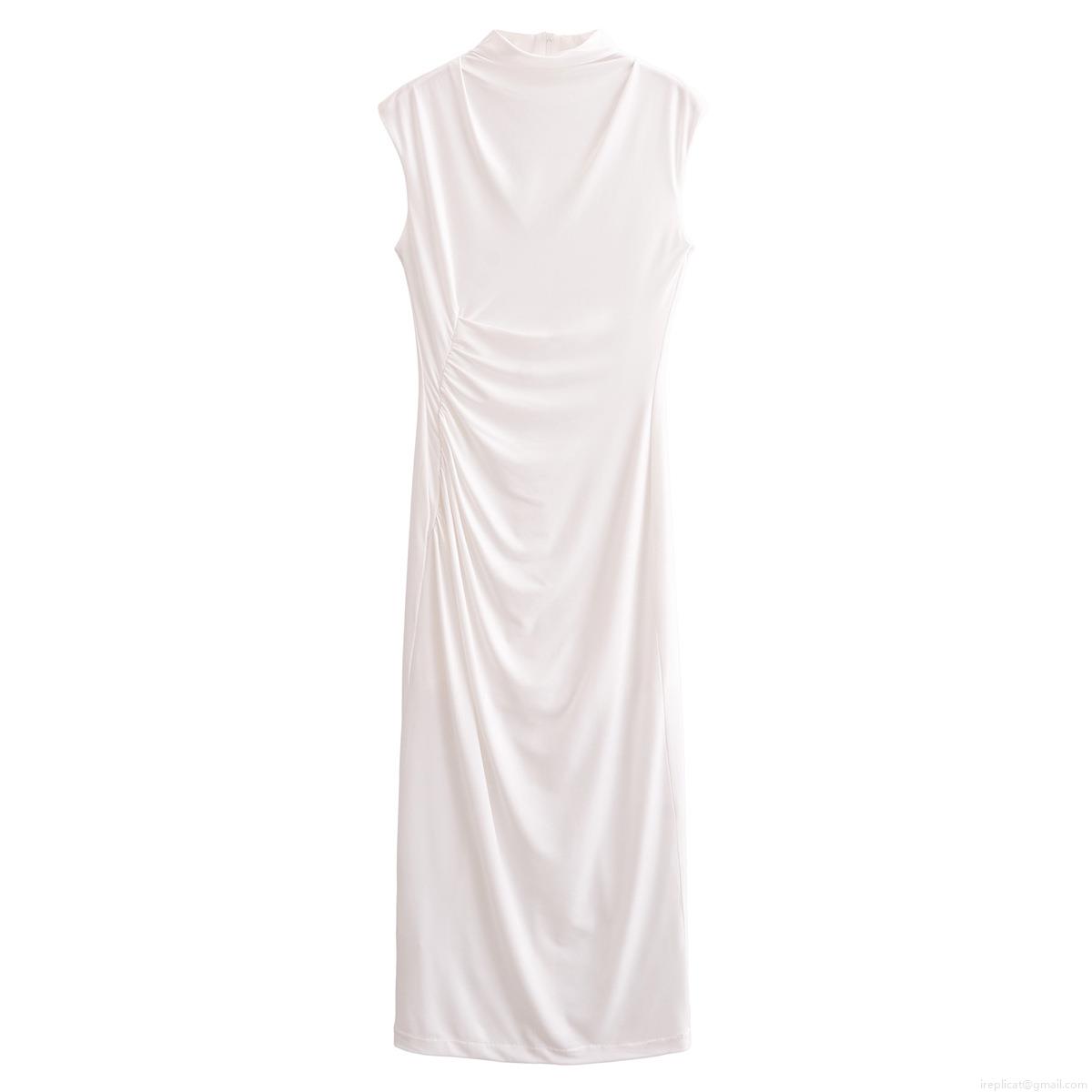 • Women's Sleeveless Mock Neck Ruched Midi Dress Solid Color Stretchy Side Slit Slim Fit Bodycon Party Dress With Back Zipper
