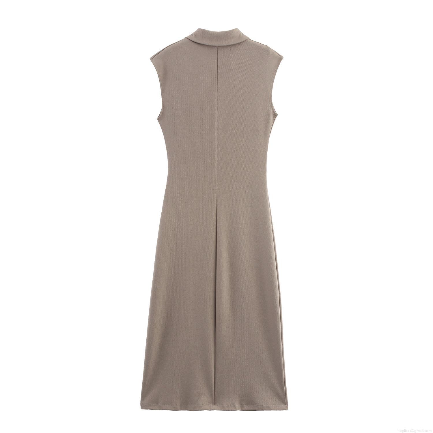 Women's Sleeveless Polo Collar Midi Dress Cotton Blend Knit Fabric With Gold Buttons And Pleated Waist For Elegant Office Wear