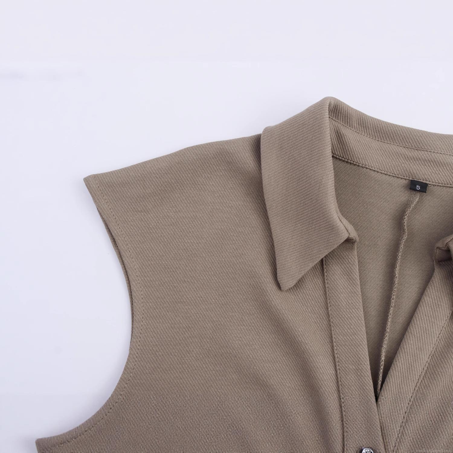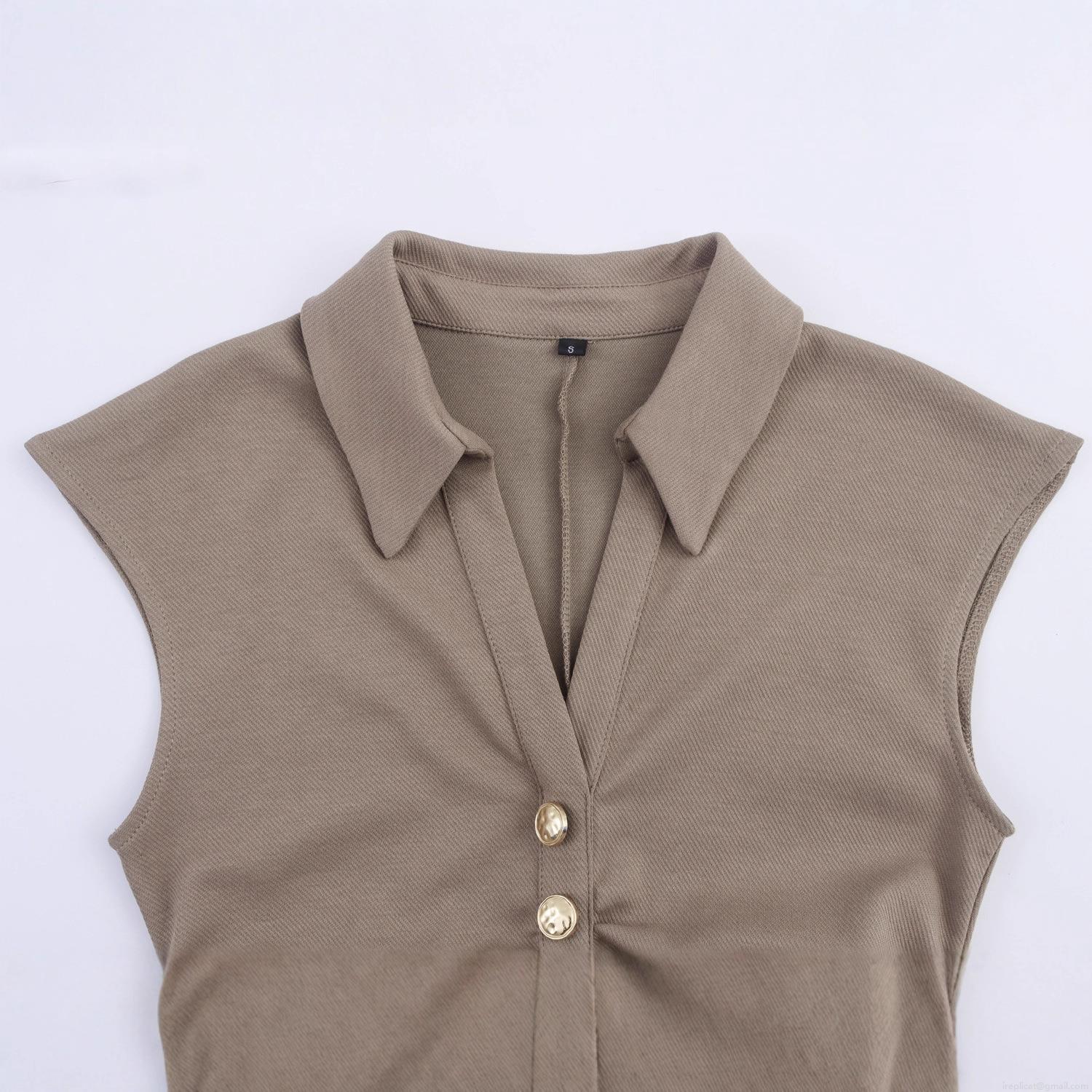 • Women's Sleeveless Polo Collar Midi Dress Cotton Blend Knit Fabric With Gold Buttons And Pleated Waist For Elegant Office Wear