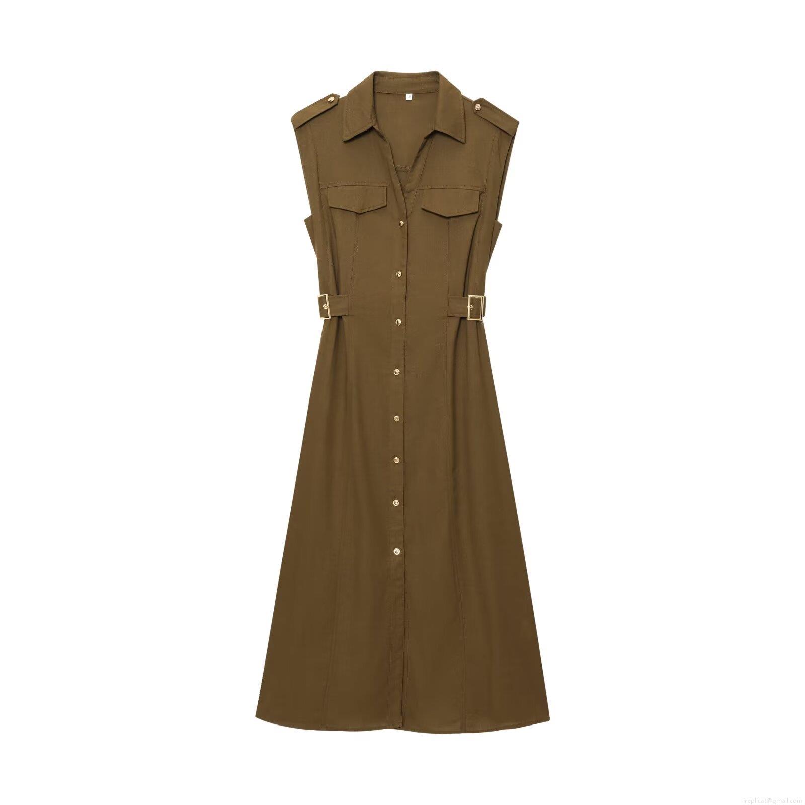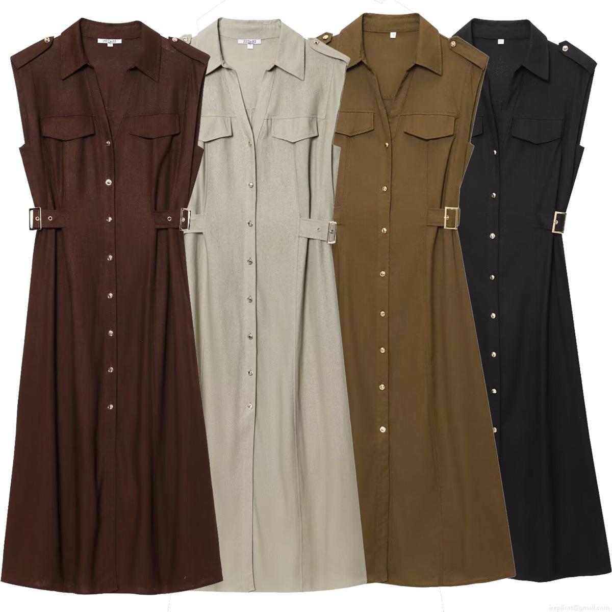 • Women's Sleeveless Shirt Dress Utility Cargo Style Lapel Button Down Midi A-Line Dress With Belt Pockets Polyester Cotton Linen Blend Casual Summer Streetwear