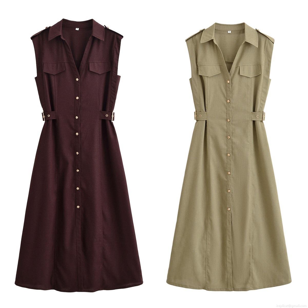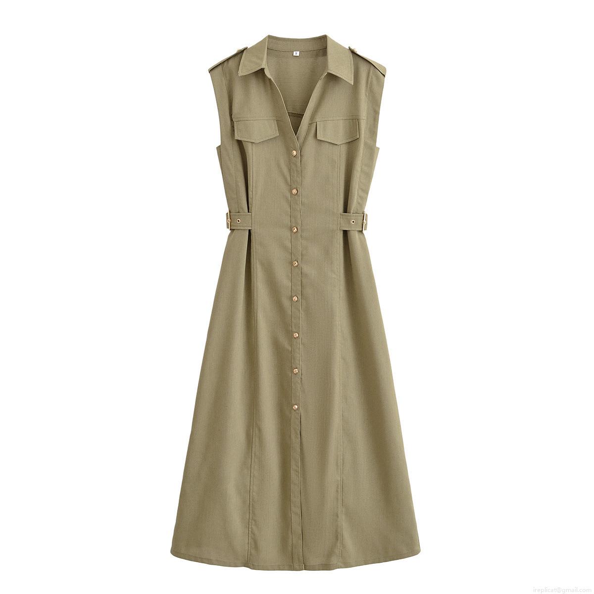 • Women's Sleeveless Shirt Midi Dress Polyester Solid Color Turn-down Collar Button-down Dress with Chest Pockets and Waist Buckle Detail for Casual Summer Street Style Lady Fashion Vestidos
