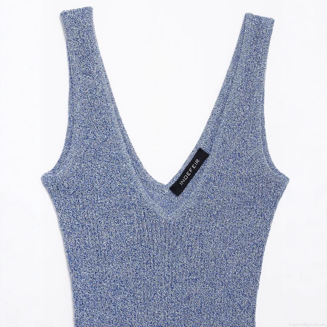 • Women's Sleeveless V-Neck Knitted Midi Dress Summer Slim Fit Bodycon Mixed Blue Color Polyester Knit Sundress Streetwear Fashion Casual Lady