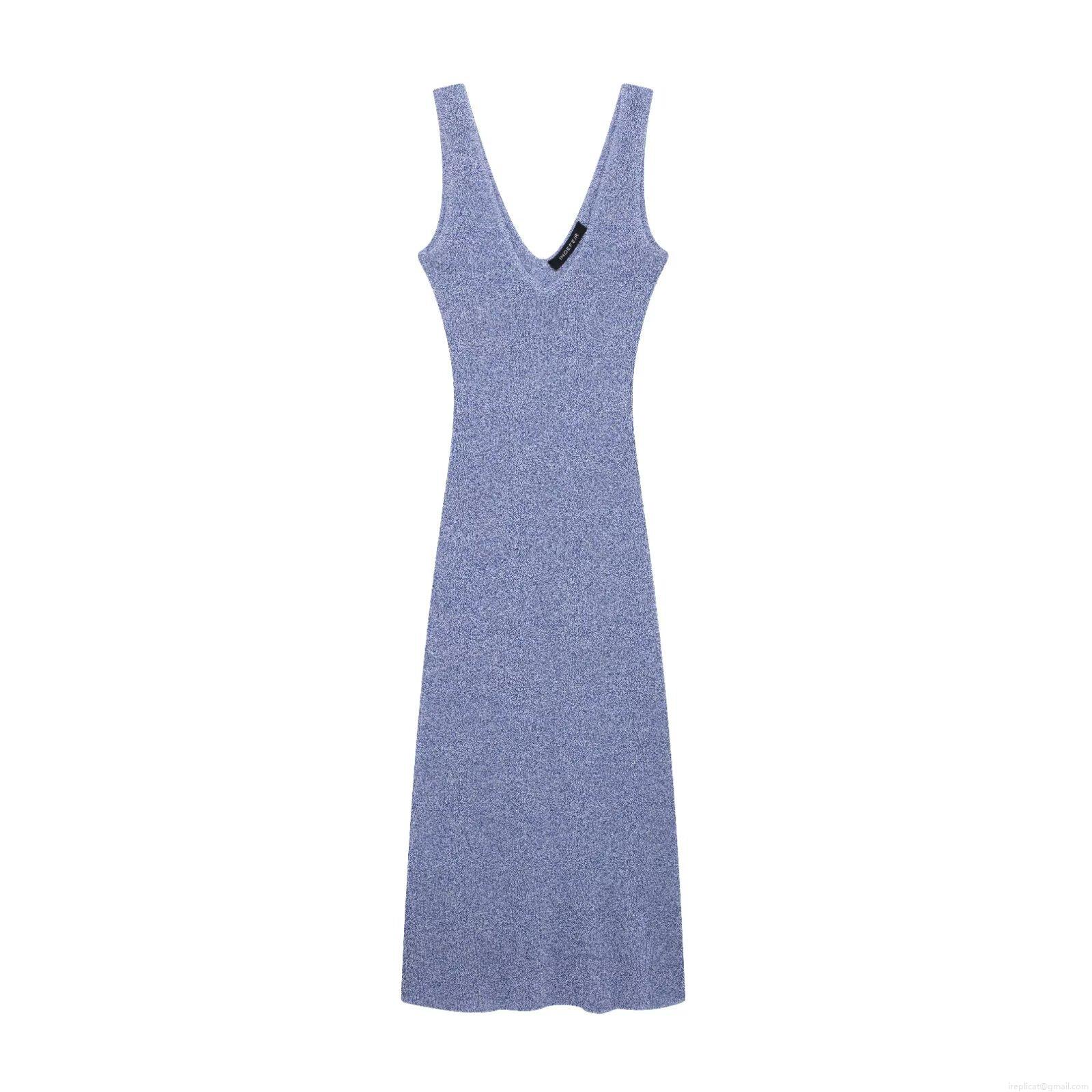 Women's Sleeveless V-Neck Knitted Midi Dress Summer Slim Fit Bodycon Mixed Blue Color Polyester Knit Sundress Streetwear Fashion Casual Lady