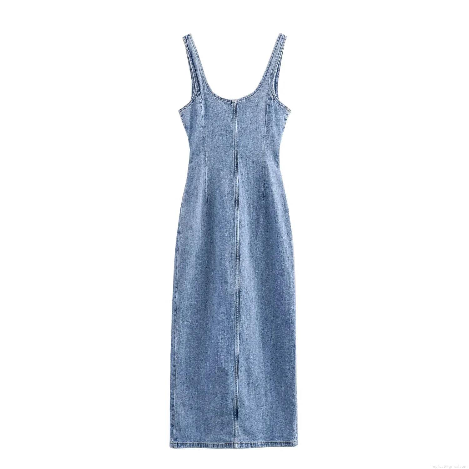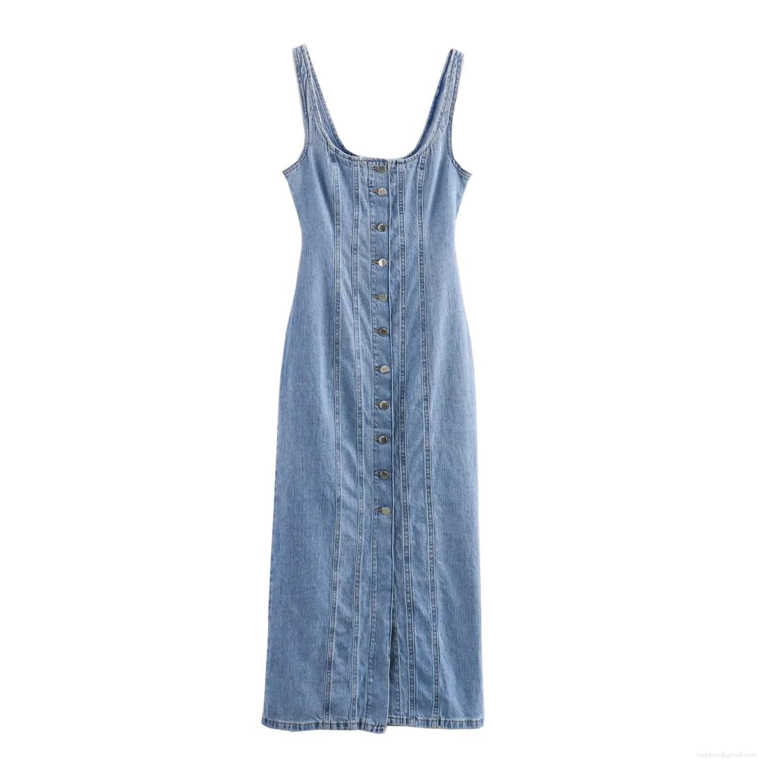 • Women's Slim Fit Denim Midi Dress Single Breasted Metal Button Front V Neck Sleeveless Strappy Bodycon Sundress Streetwear Casual Daily Dress