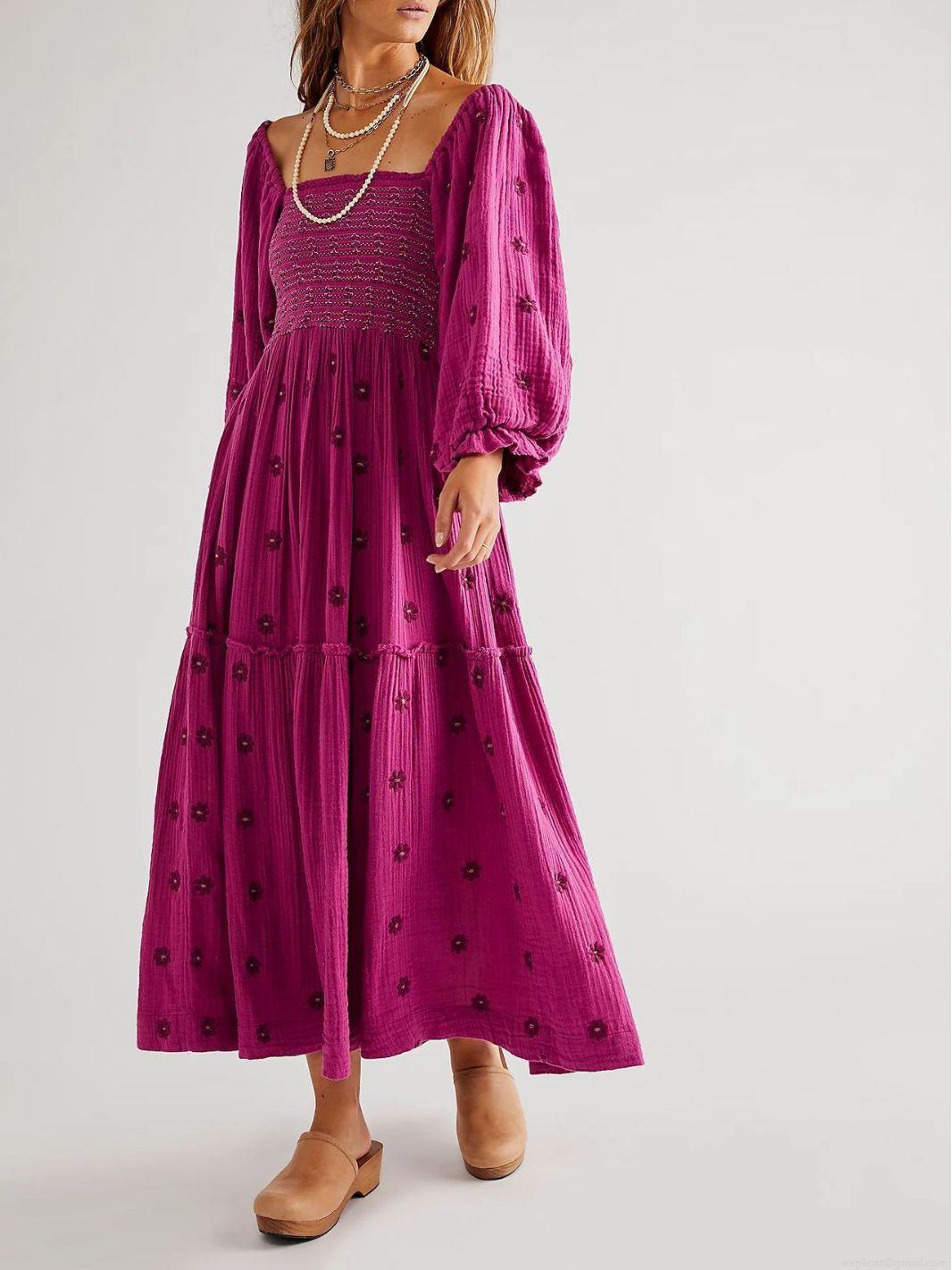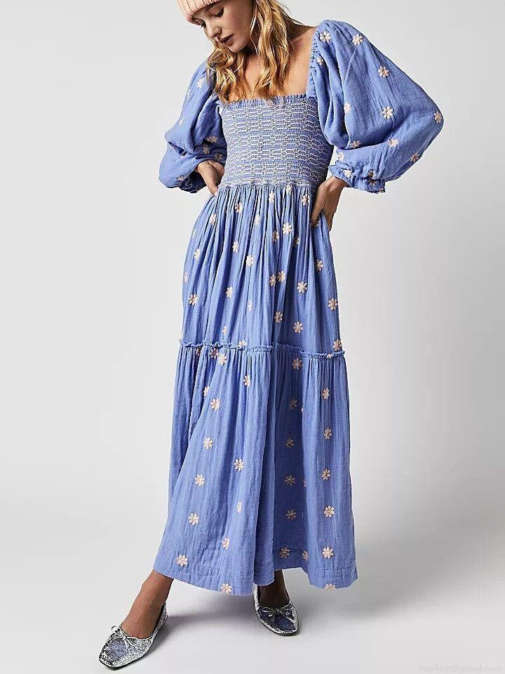 • Women's Square Neck Embroidered Smocked Midi Dress Puff Sleeve Bohemian Floral A-Line Polyester Long Skirt For Summer Vacation Elegant Party Ladies Dress