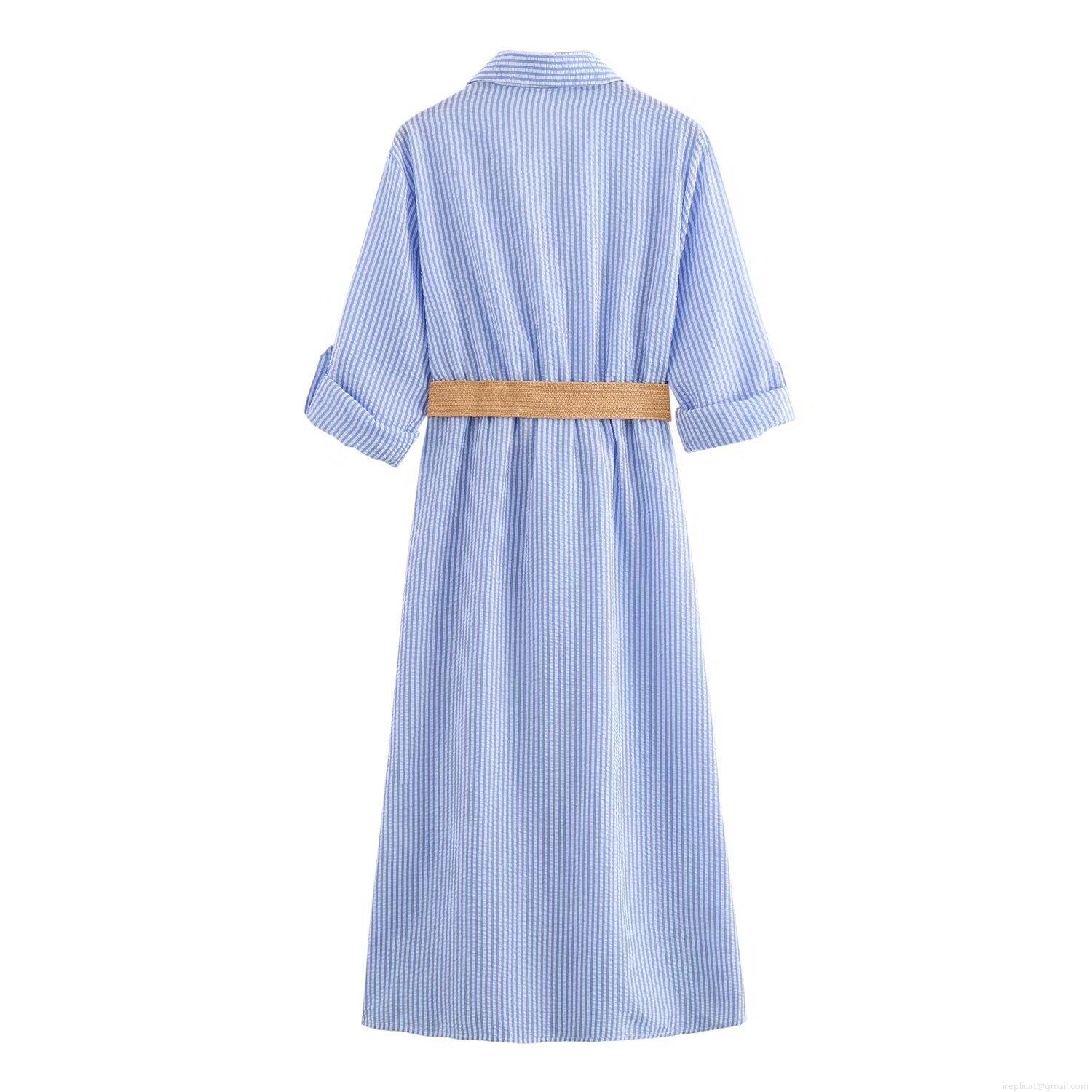 Women's Striped Seersucker Shirt Dress With Woven Belt And Chest Pockets Summer Casual Button Down Midi Dress For Vacation Streetwear